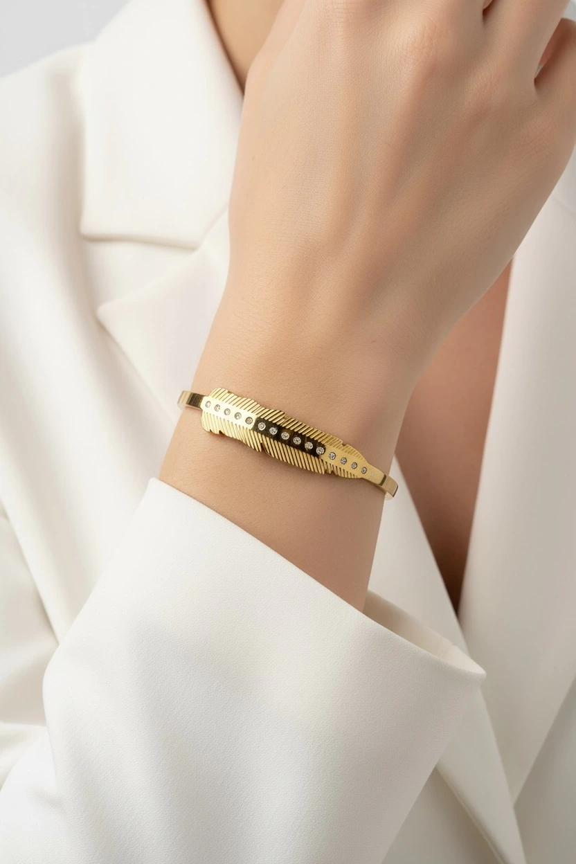 Sıralı Taş Detay Yaprak Model Gold Altın Kaplama Bileklik