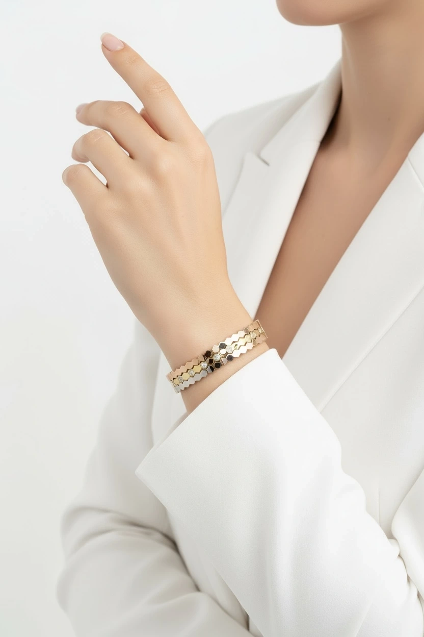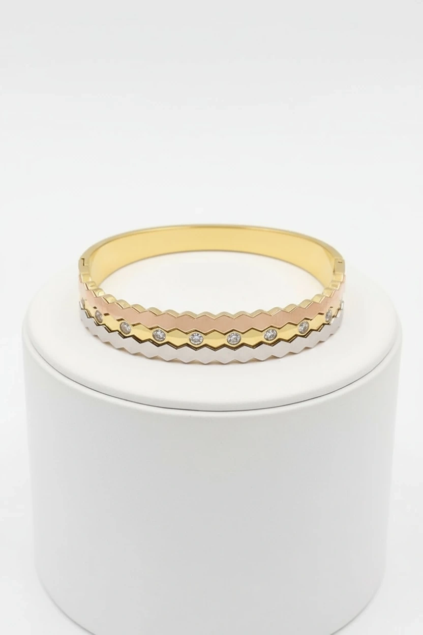 Tek Taş Detaylı Zikzak Model Üç Renk Altın Kaplama Bileklik