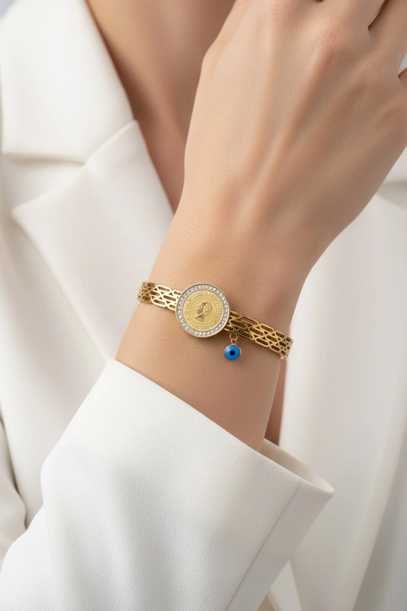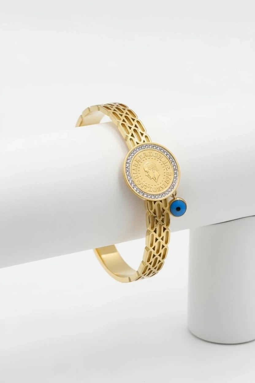 Halka Çeyrekli Göz Detay Gold Altın Kaplama Bileklik