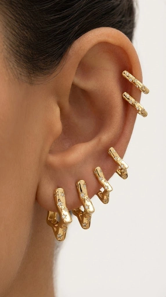 Altılı Yıldız Taş Detay Yıldız Model Gold Altın Kaplama Çoklu Küpe