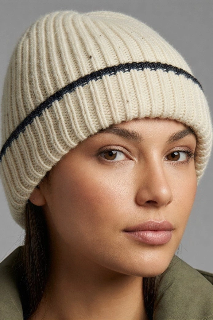 Ekru Renk Siyah Çizgi Detay Kadın Bere