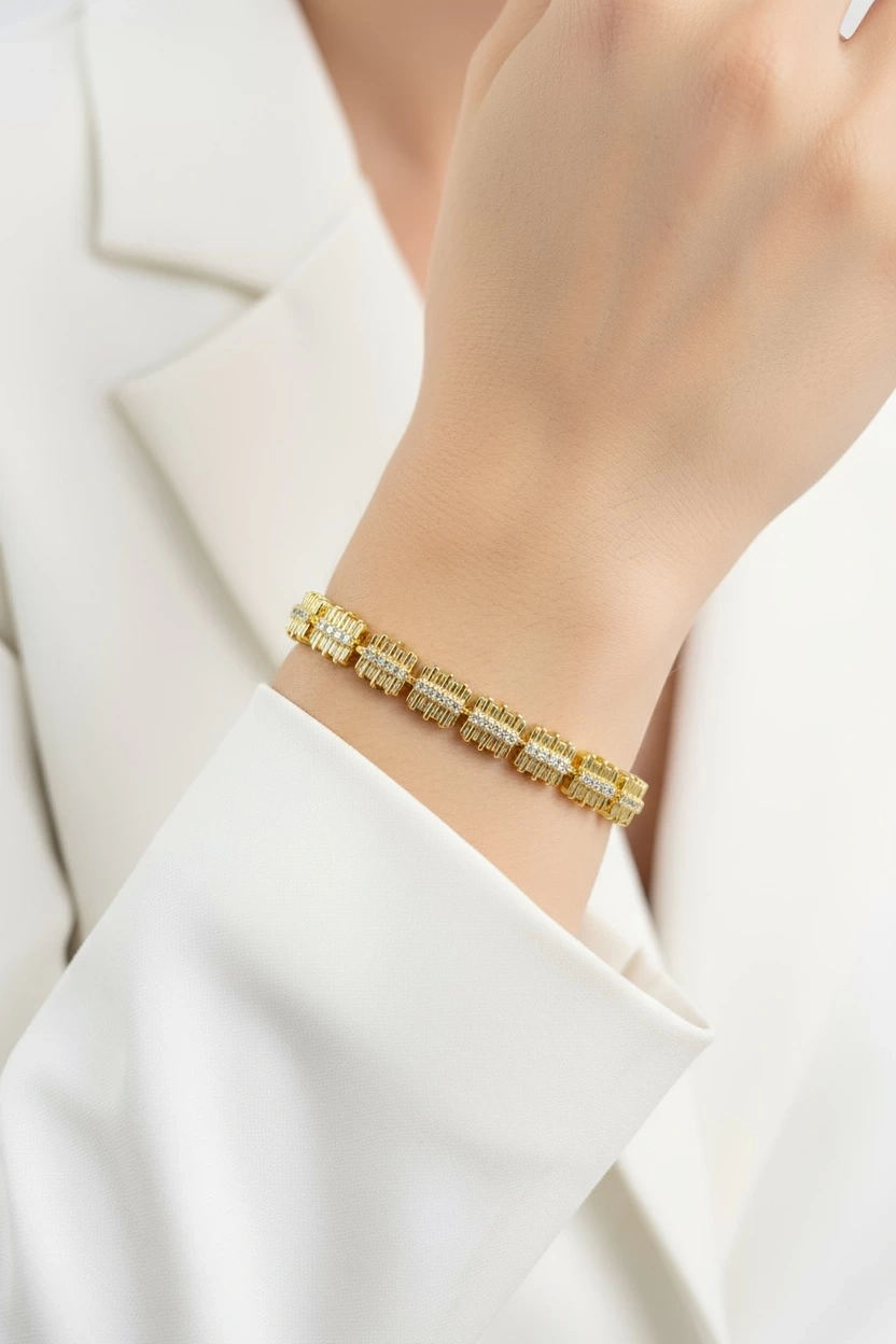 Asimetrik Plaka Model Taş Detay Gold Altın Kaplama Bileklik, şıklığı ve zarafeti bir arada sunan bir aksesuardır.