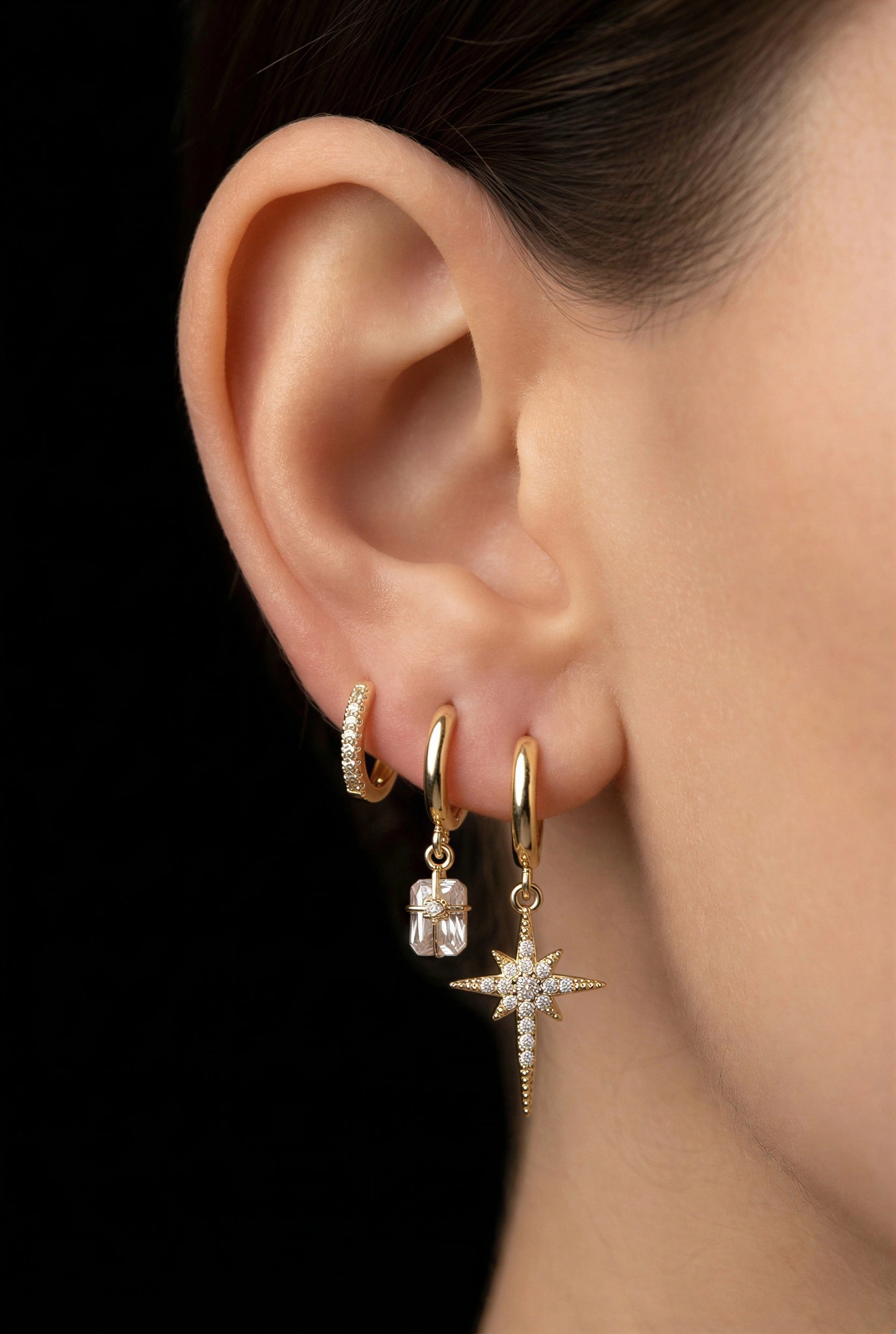 Baget Yıldız Model Gold Altın Kaplama Üçlü Küpe