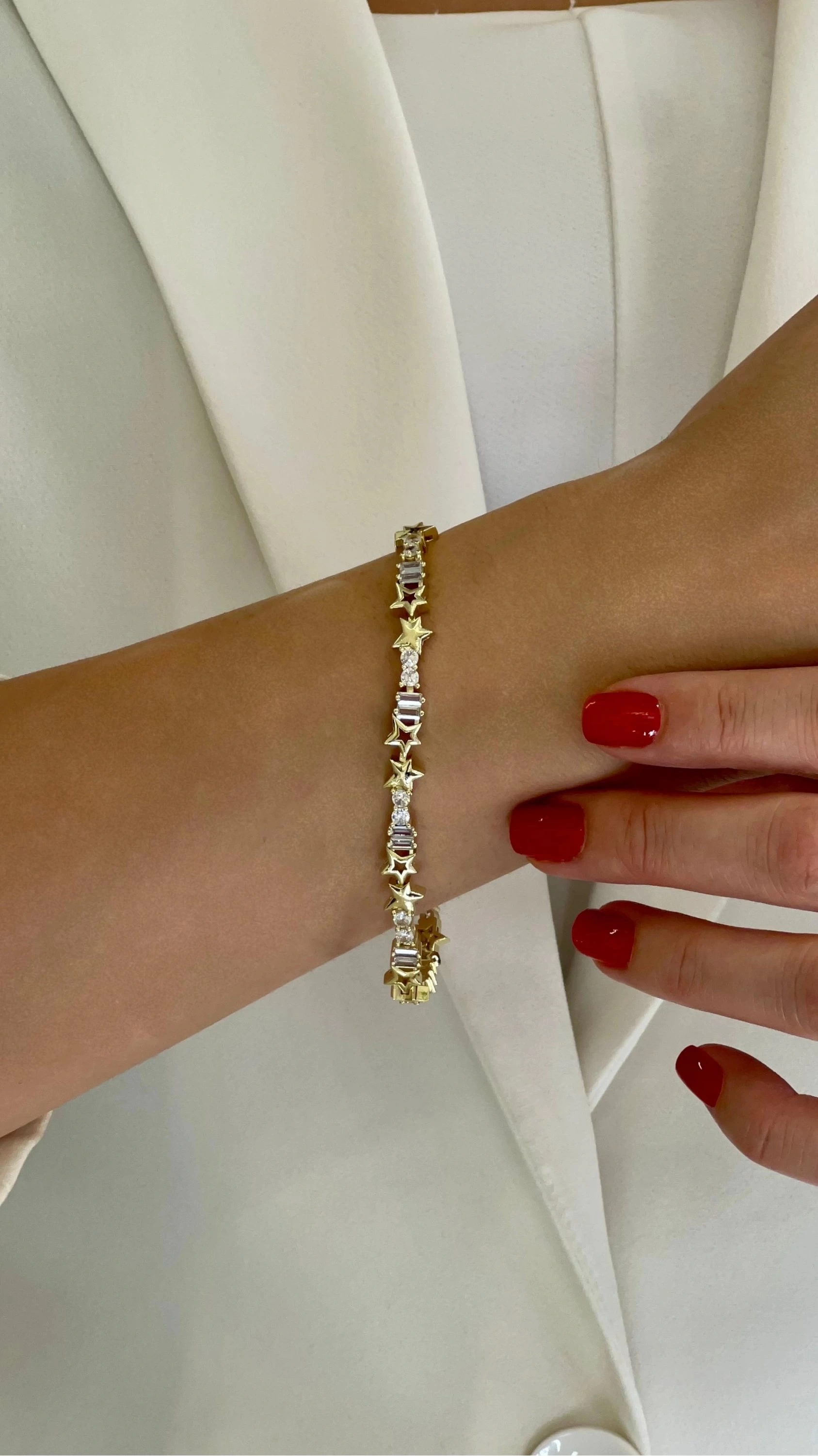 Bu şık Baget Taş Detay Yıldız Model Gold Altın Kaplama Bileklik, hem şıklığı hem de zarafeti bir arada sunuyor. 14K altın kaplama ile tasarlanmış olan bu bileklik, özel günlerde ya da günlük kullanımda tarzınızı tamamlayacak harika bir seçenektir.