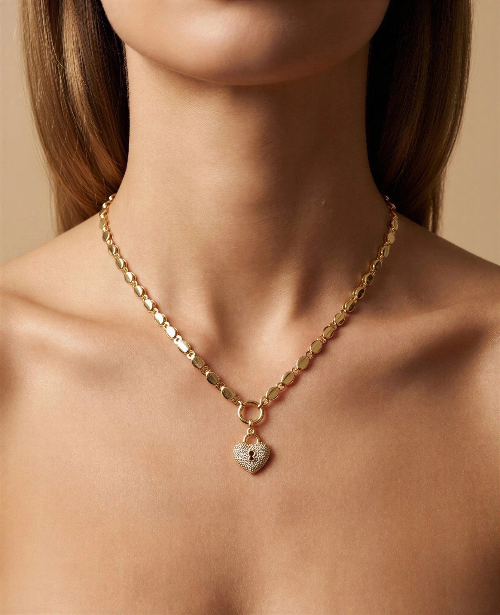 Pul Zincir Taşlı Kalp Model Gold Altın Kaplama Kolye