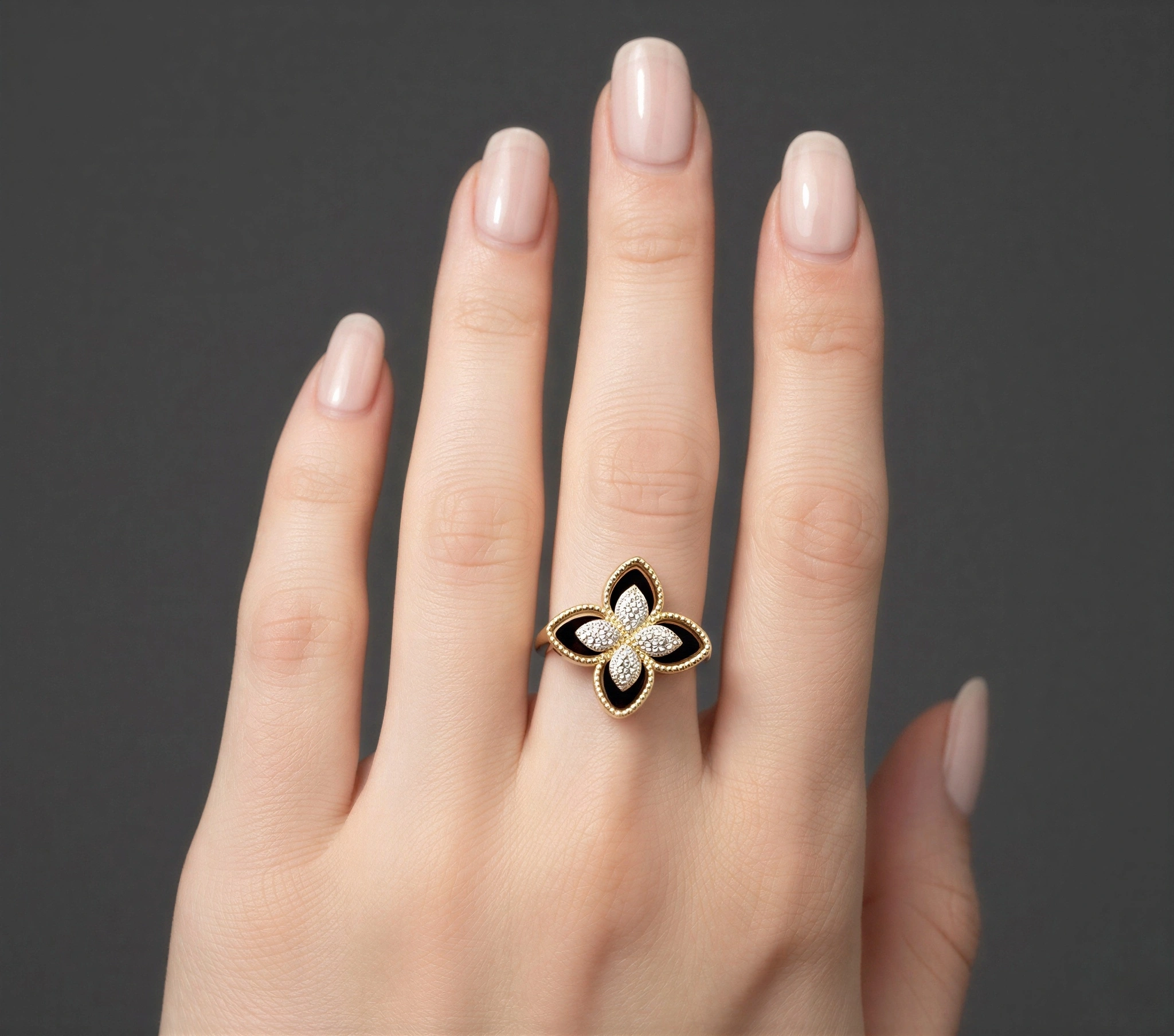 Siyah Yoncalı Taş Detay Gold Altın Kaplama Yüzük