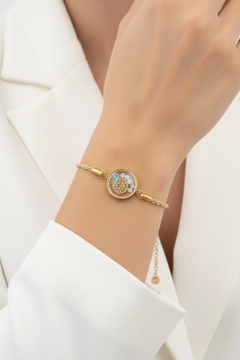 Burgu Cam Çerçeve Yaşam Çiçeği Model Gold Altın Kaplama Çelik Bileklik