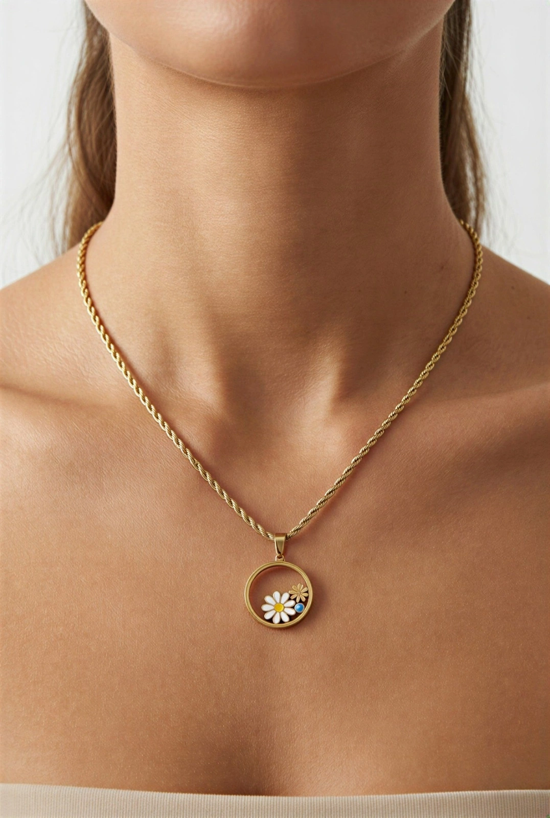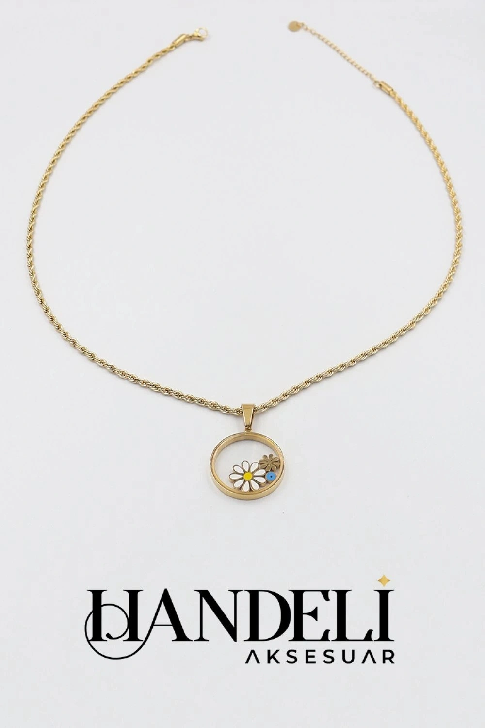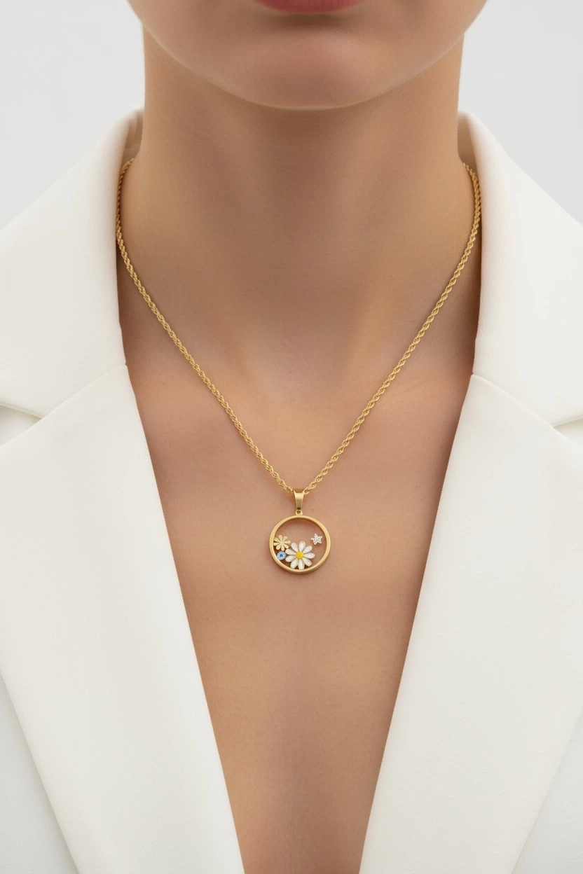 Burgu Zincir Cam Çerçeve Papatya Model Gold Altın Kaplama Çelik Kolye