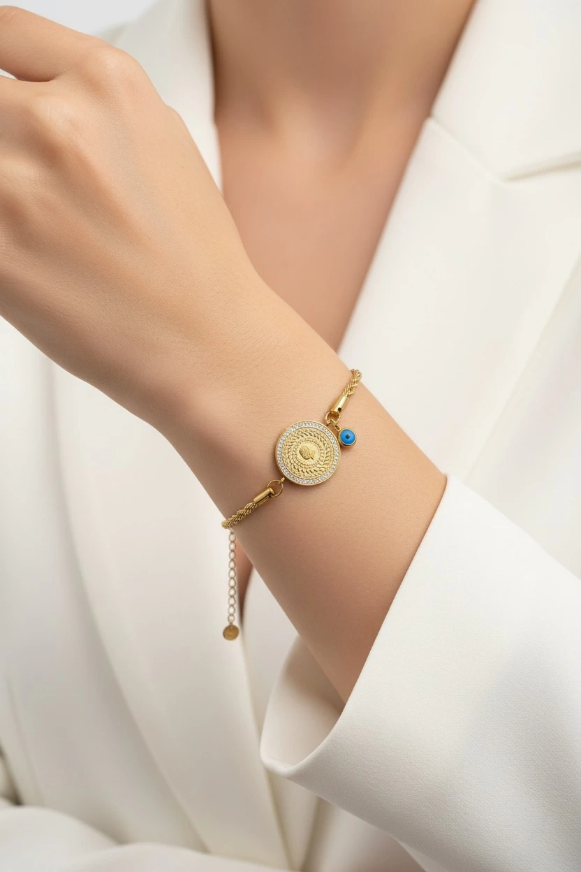 Burgu Zincir Çeyrek Model Boncuklu Gold Altın Kaplama Çelik Bileklik