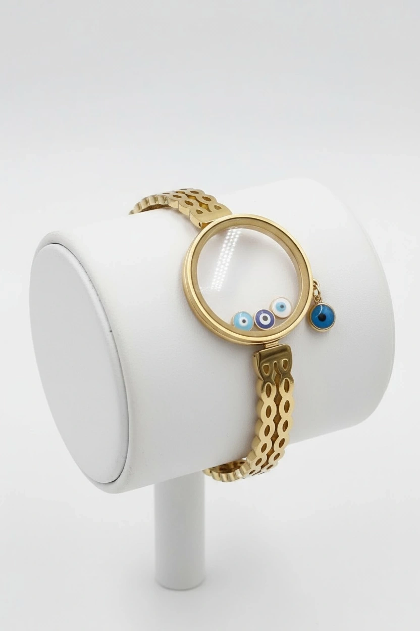 Cam Çerçeve Boş Nazar Boncuk Detay Dalga Model Gold Altın Kaplama Kelepçe