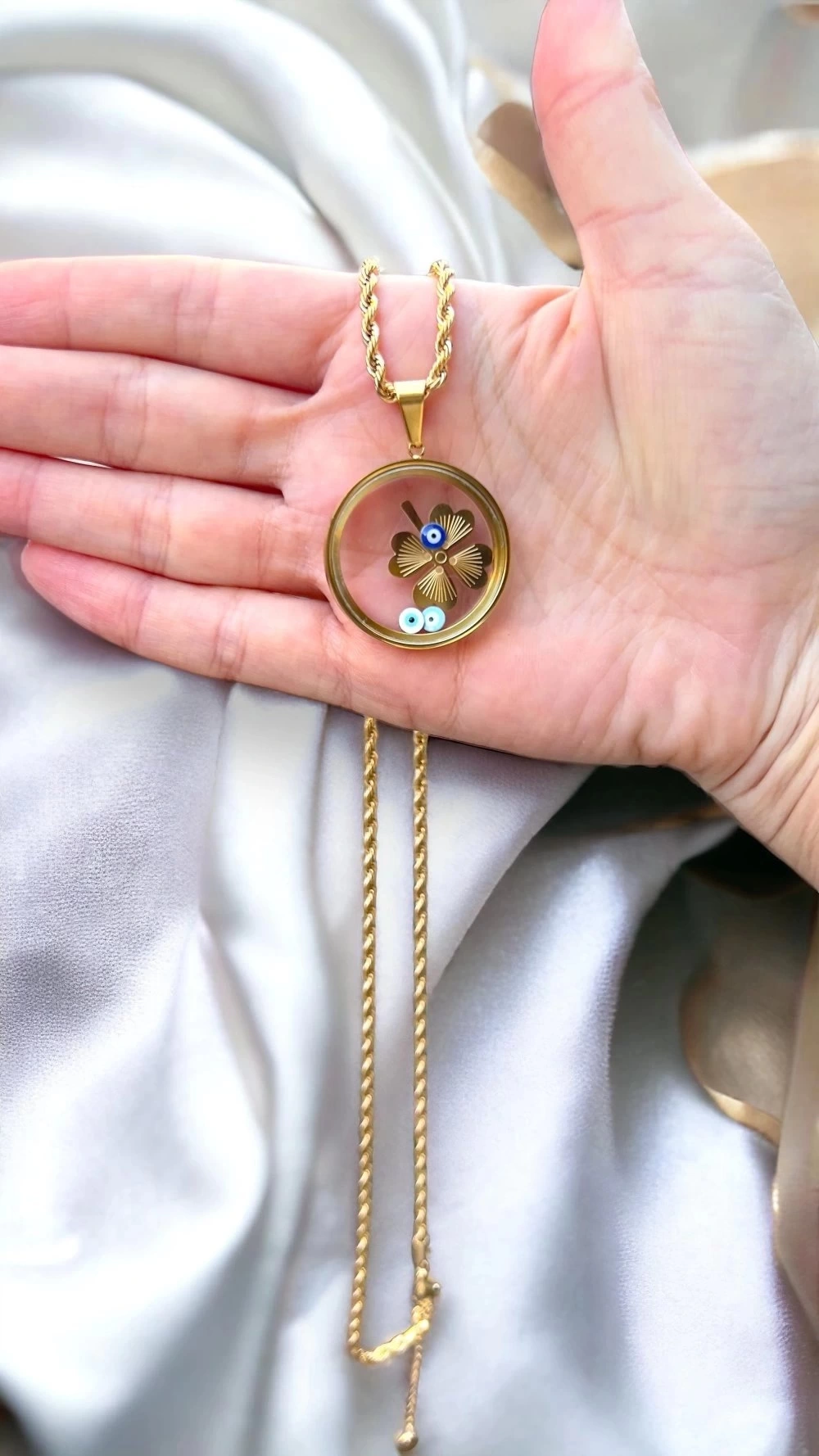 Cam Çerçeve Burgu İtalyan Zincir Yonca Gold Altın Kaplama Çelik Kolye