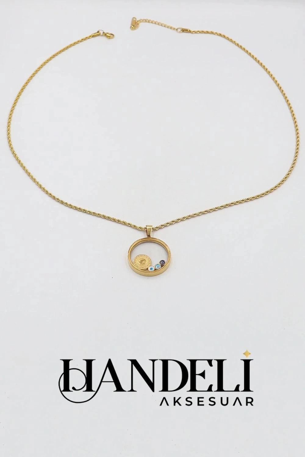 Cam Çerçeve Uzun Burgu Zincir Çeyrek Model Gold Altın Kaplama Çelik Kolye
