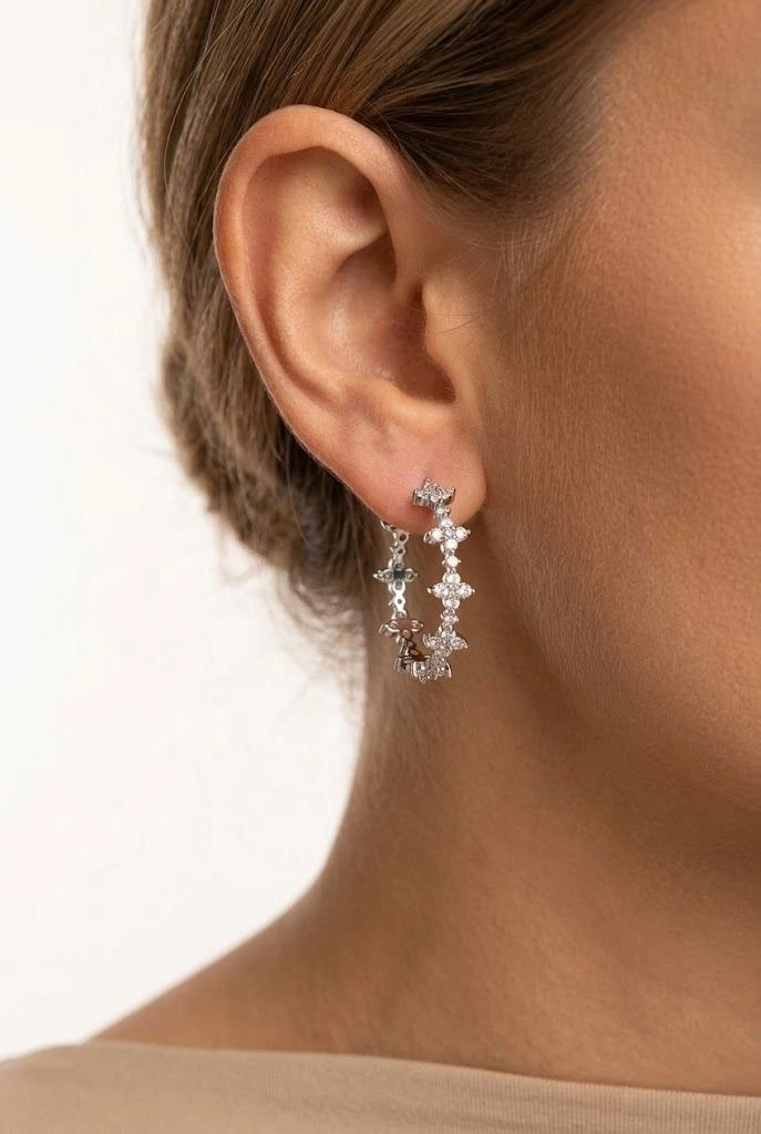 Çiçek Model Beyaz Altın Kaplama Küpe