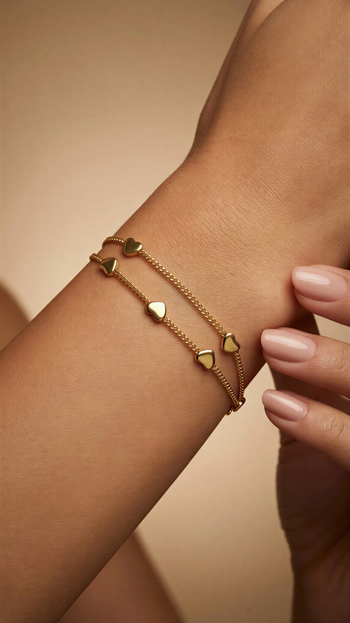 Çift Sıra Kalp Model Gold Altın Kaplama Çelik Bileklik