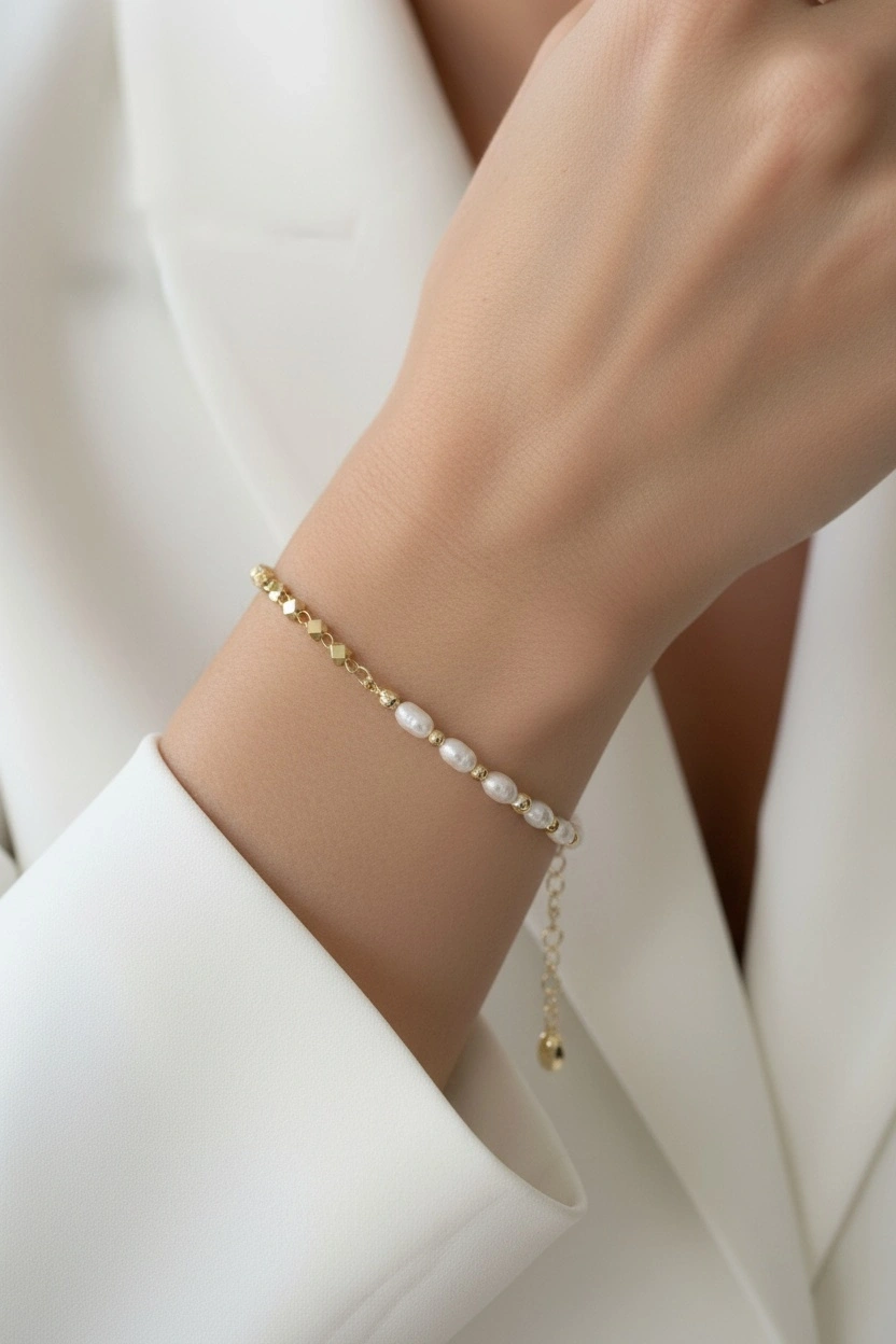 Çift Zincir İnci Detay Model Gold Altın Kaplama Bileklik