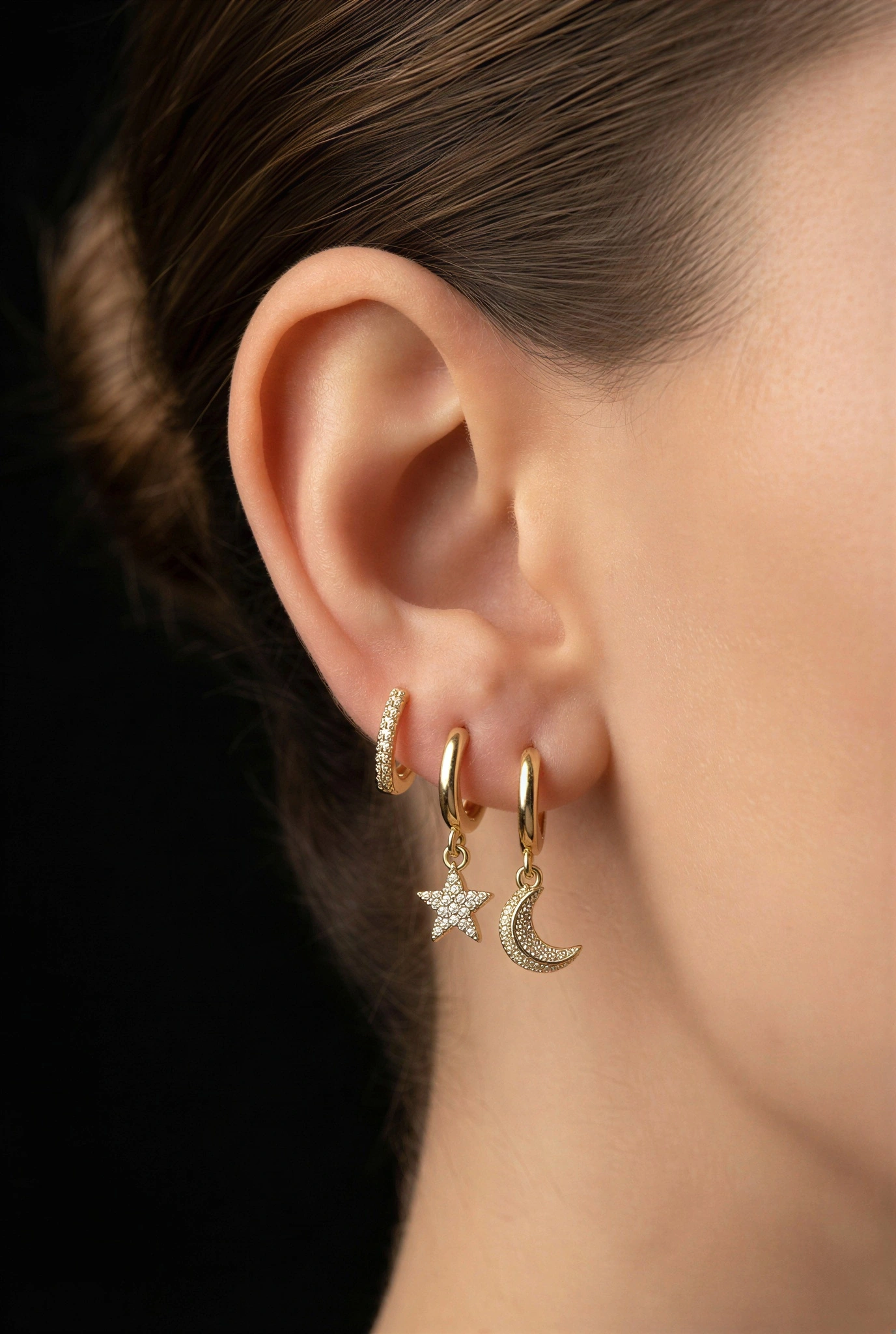 Ay Yıldız Model Gold Altın Kaplama Üçlü Küpe