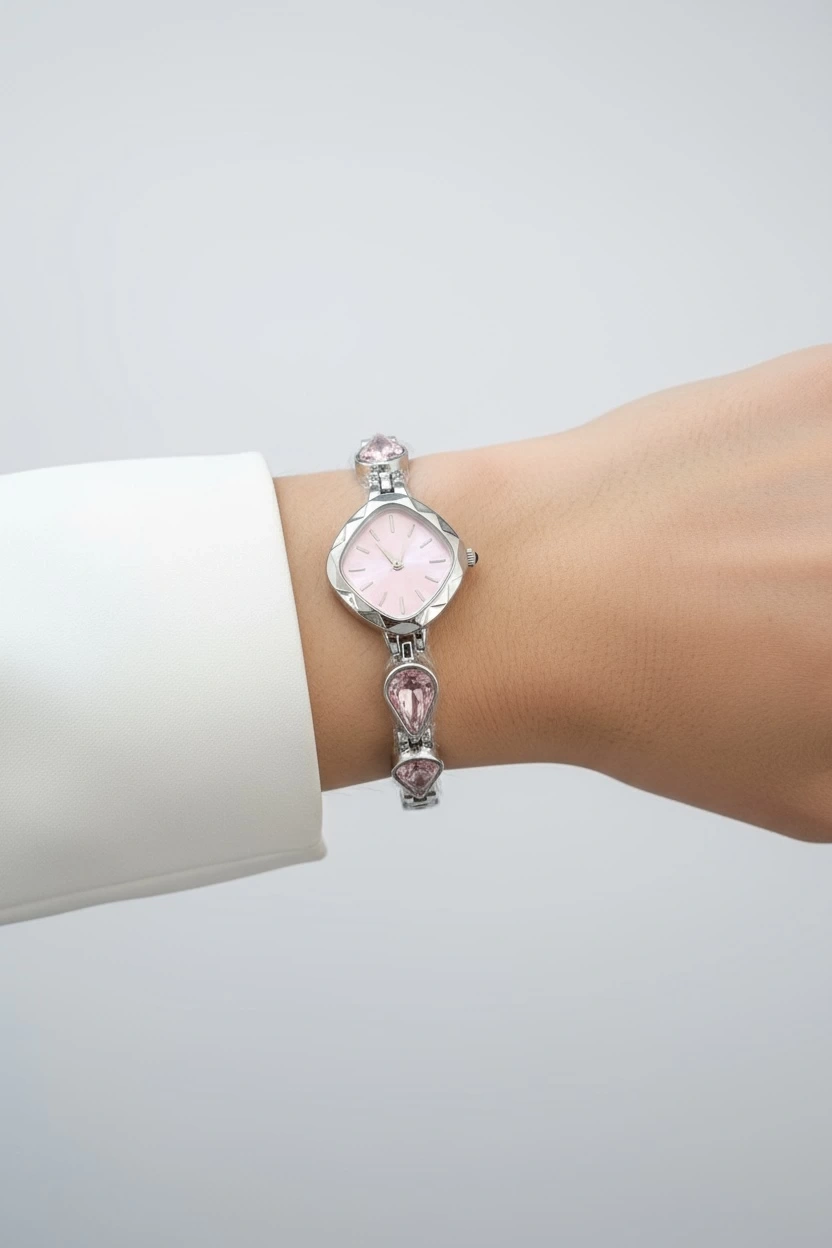 Damla Beyaz Kordon Dörtgen Pembe Kadran Model Kadın Kol Saati