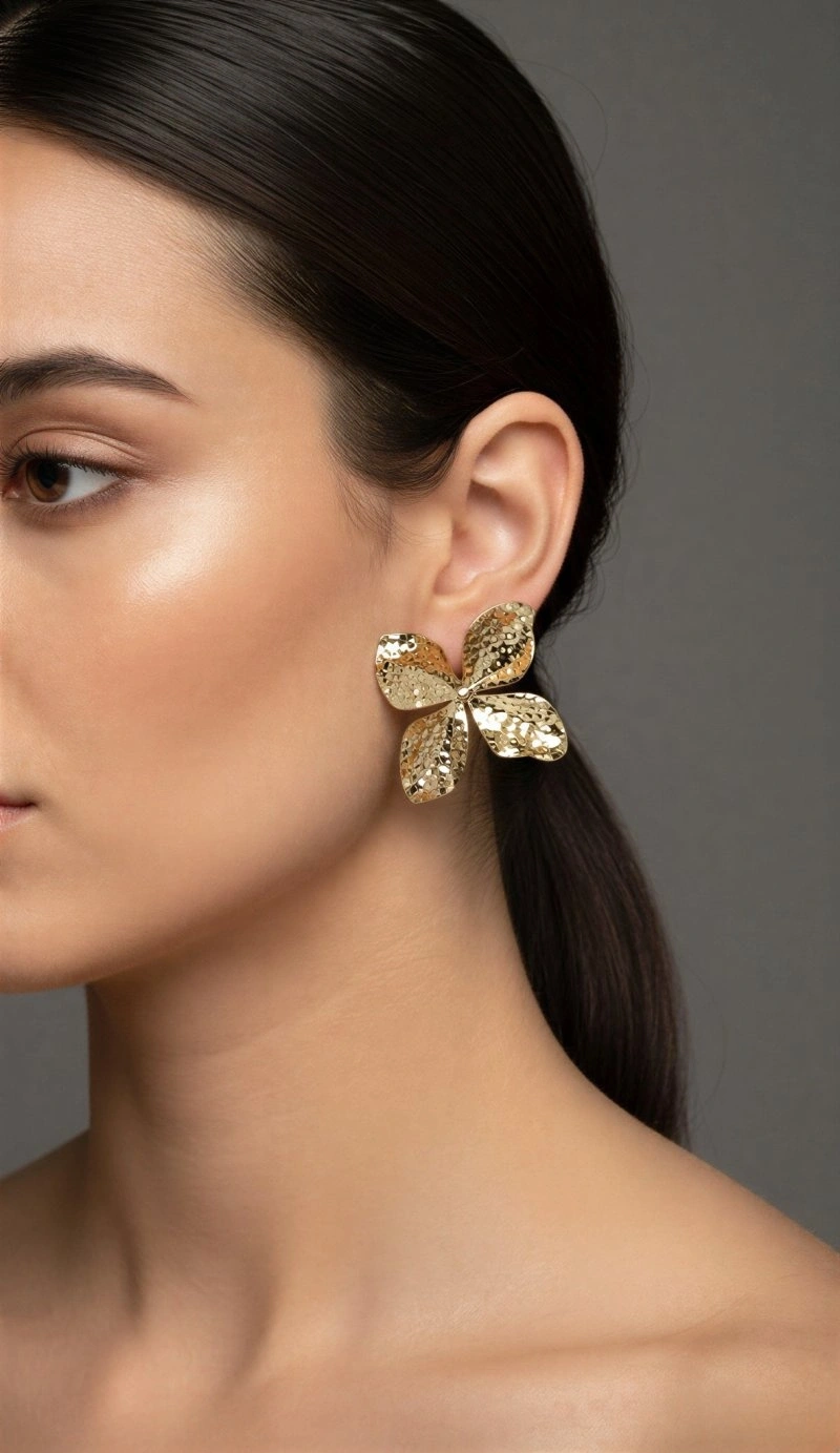 Desenli Çiçek Model Gold Altın Kaplama Küpe