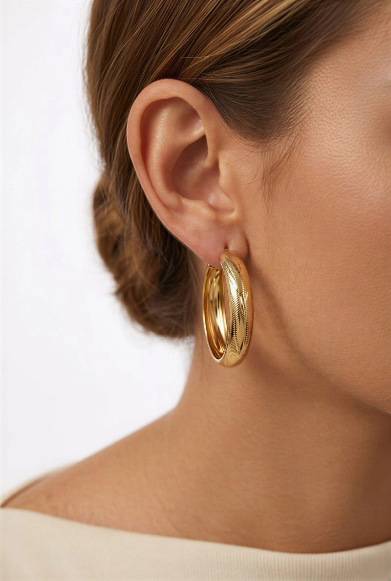 Desenli Halka Model Gold Altın Kaplama Küpe