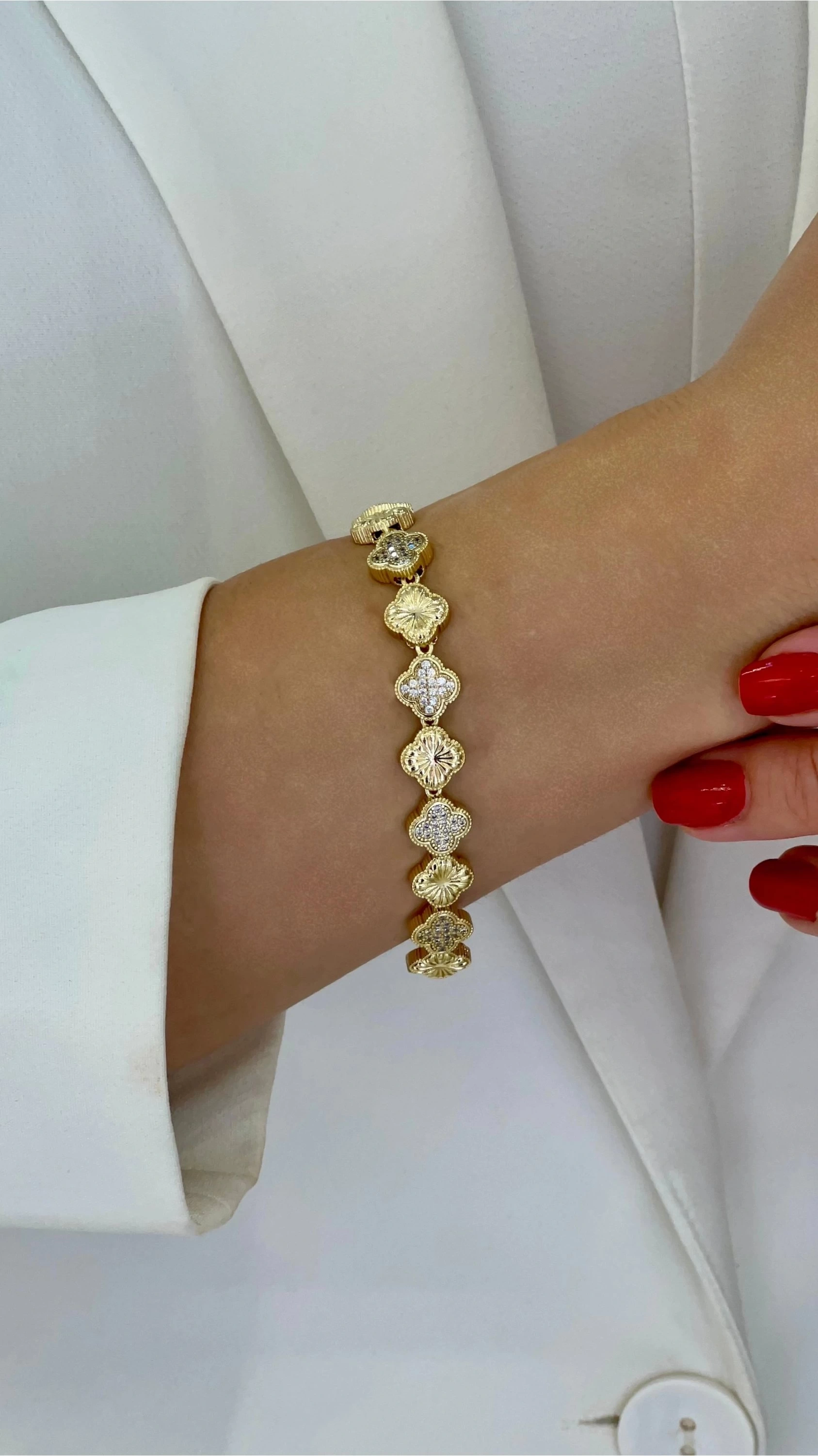 Desenli Yonca Model Taş Detay Gold Altın Kaplama Bileklik