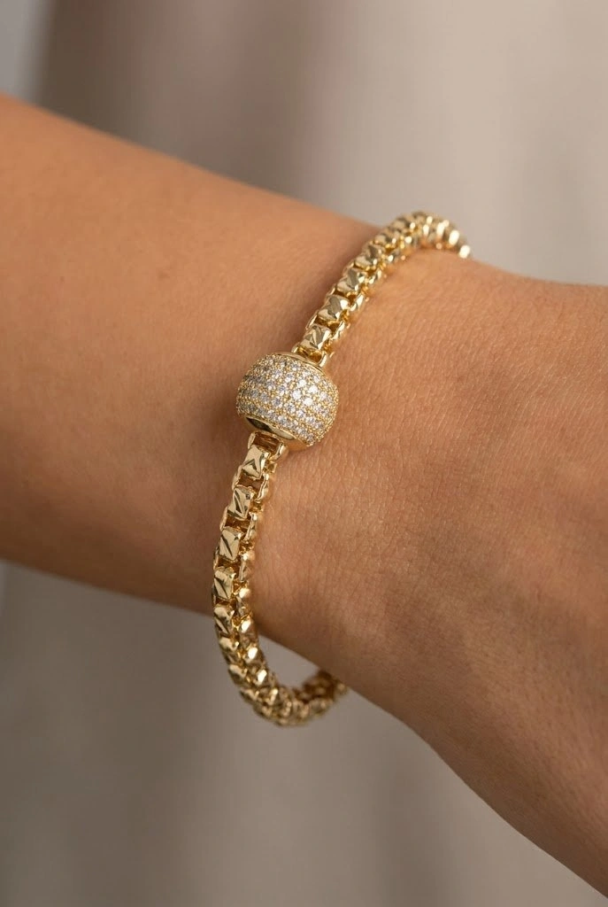 Desenli Zincir Taşlı Top Model Gold Altın Kaplama Bileklik