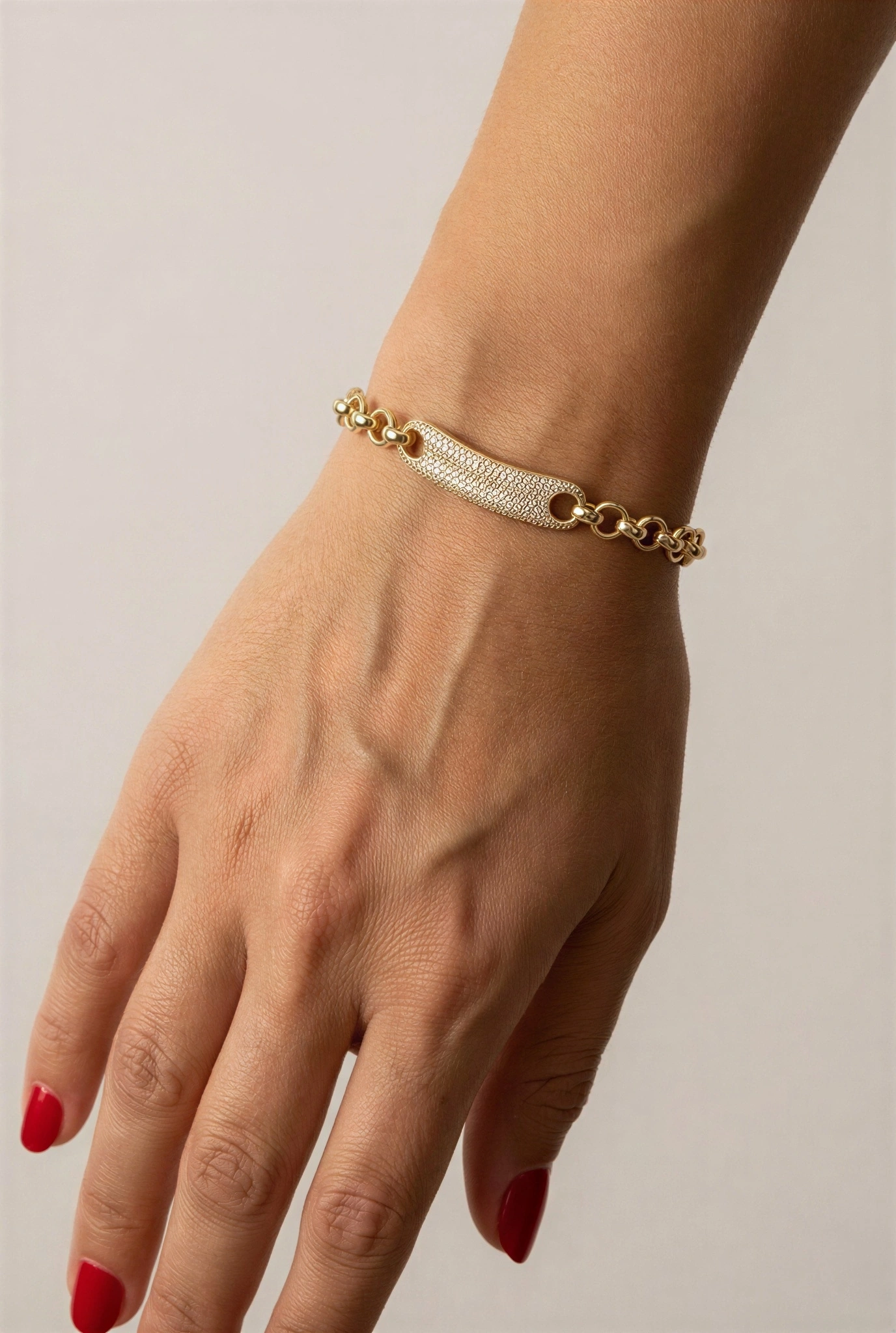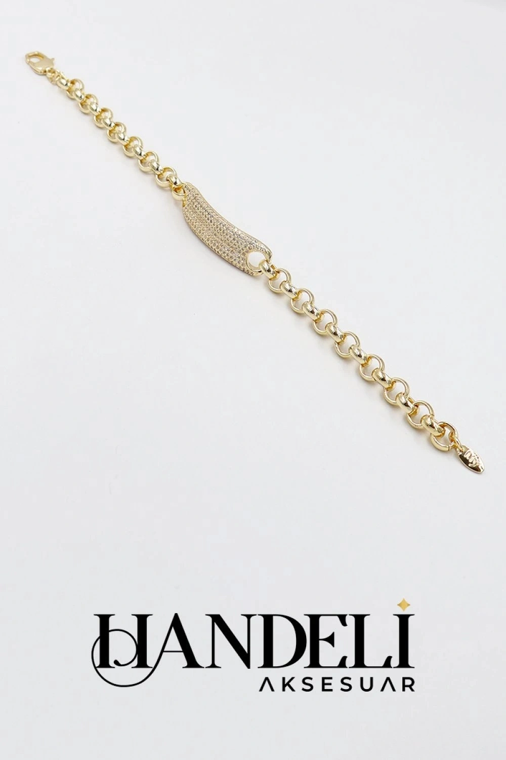 Düz Zincir Taşlı Plaka Detay Gold Altın Kaplama Bileklik