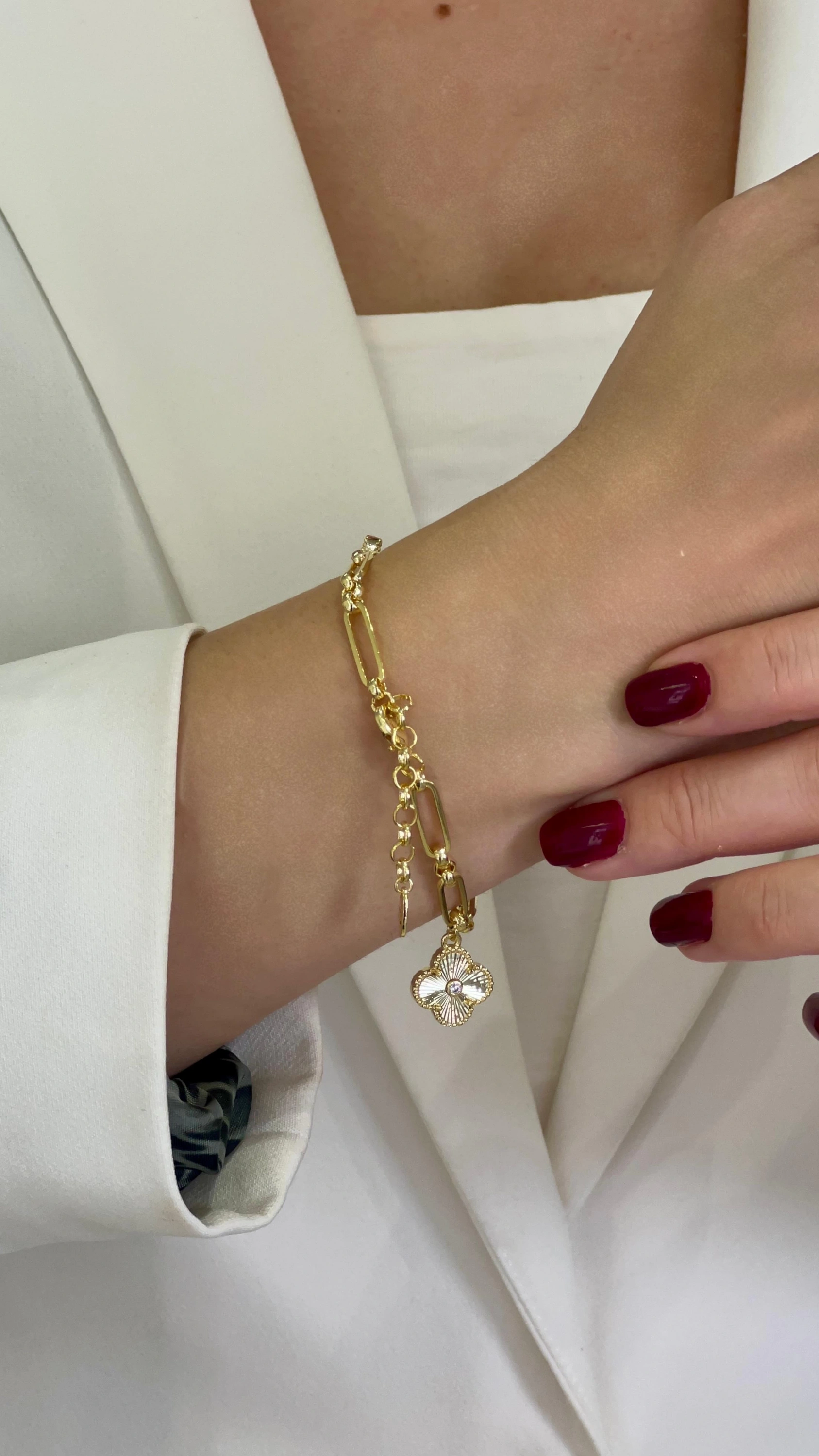 Elips Zincir Sallantılı Yonca Model Gold Altın Kaplama Bileklik
