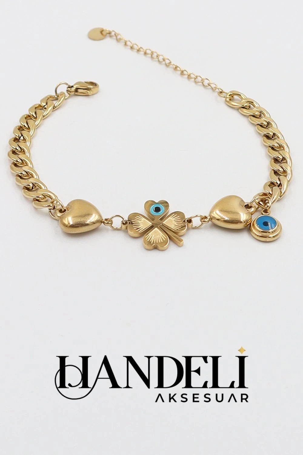 Ezik Bağlı Model Kalp Yonca Detay Gold Altın Kaplama Çelik Bileklik