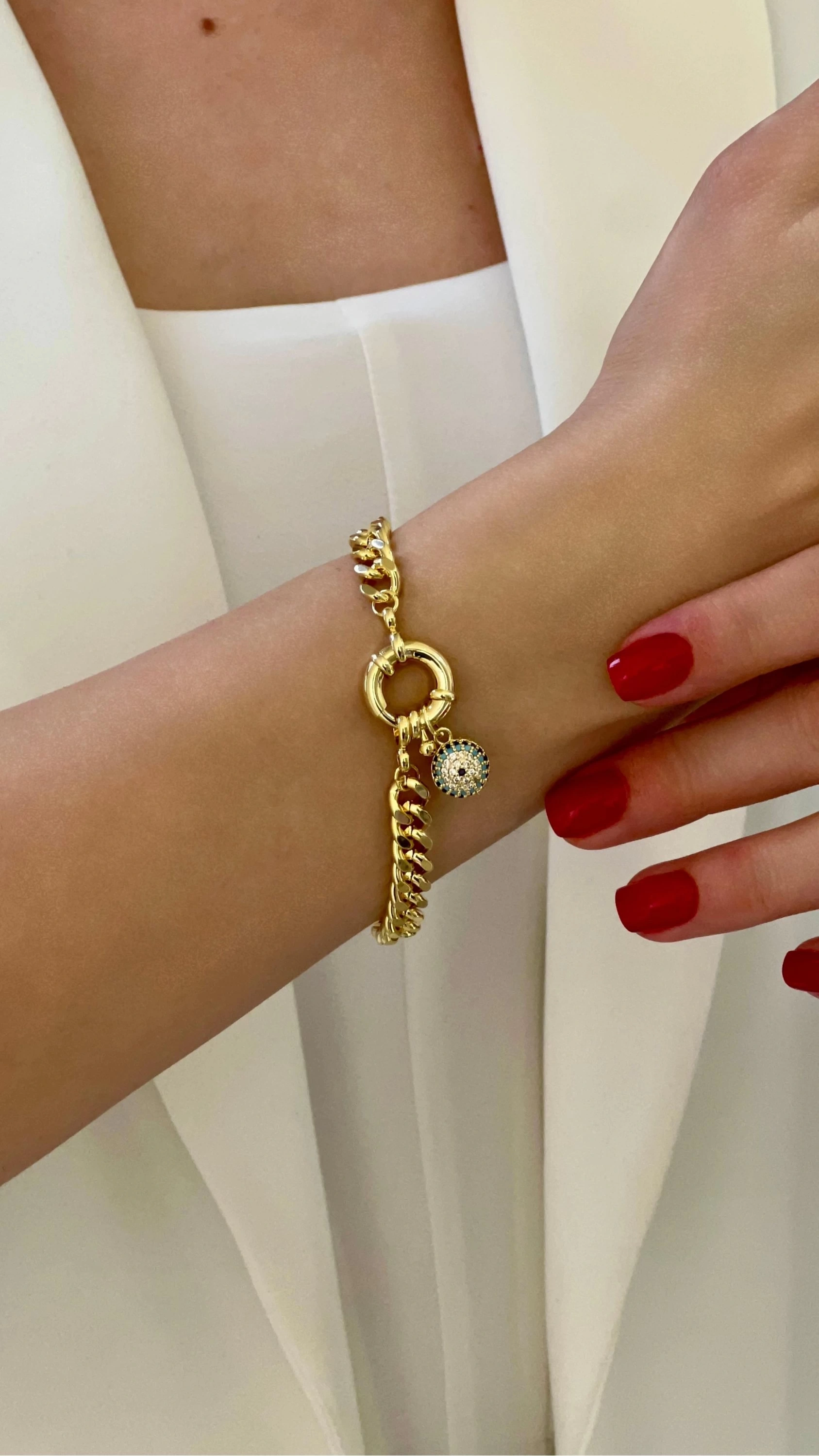Bu şık bileklik, şıklık ve zarafet arayanların favorisi olmaya aday! Altın kaplama ile tasarlanmış, zincir dümen kilit göz detayıyla benzersiz bir görünüme sahip. Hem günlük hayatta hem de özel davetlerde rahatlıkla kullanabileceğiniz bu bileklik, tarzınıza şıklık katacak. Hediye seçenekleri arasında da ilk sıralarda yer alabilir.