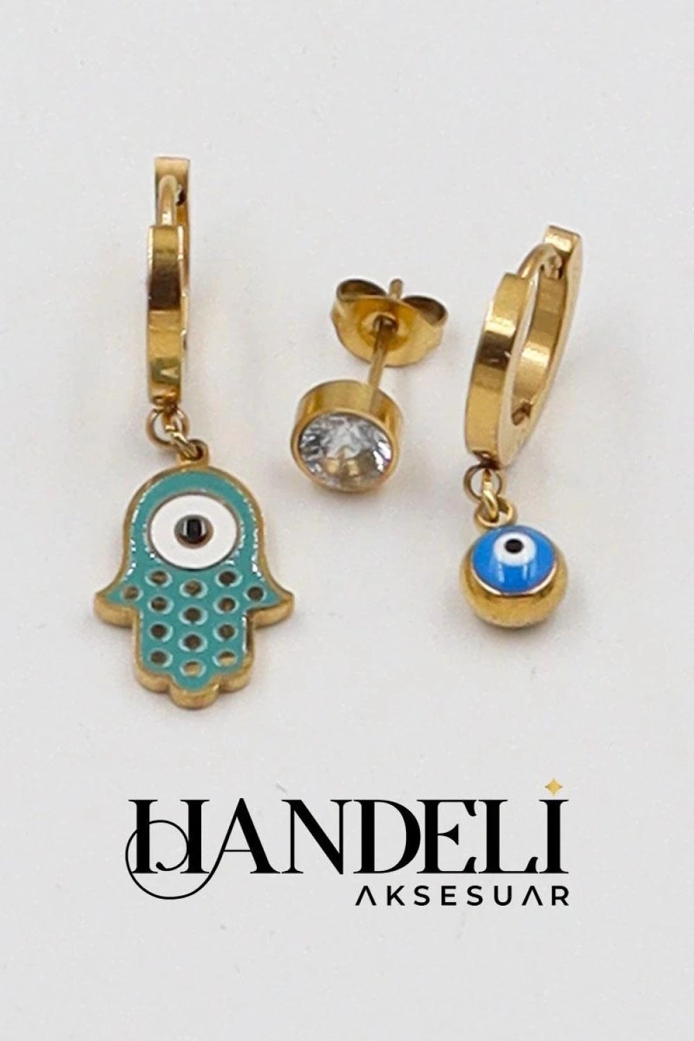 Fatımanın Eli Nazar Boncuk Detay Çelik Gold Altın Kaplama Üçlü Küpe