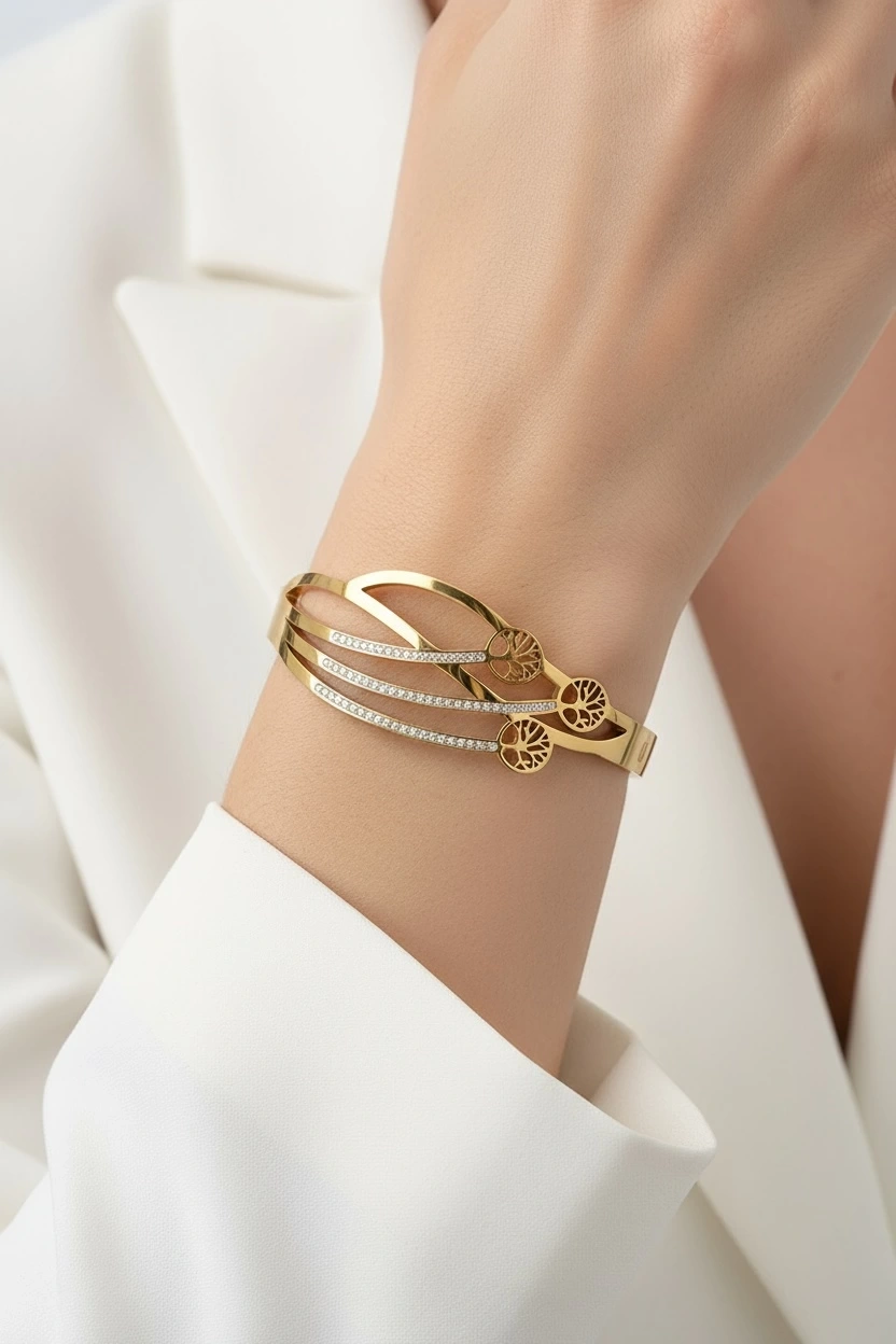 Hayat Ağacı Üç Geçiş Taşlı Gold Altın Kaplama Çelik Bileklik
