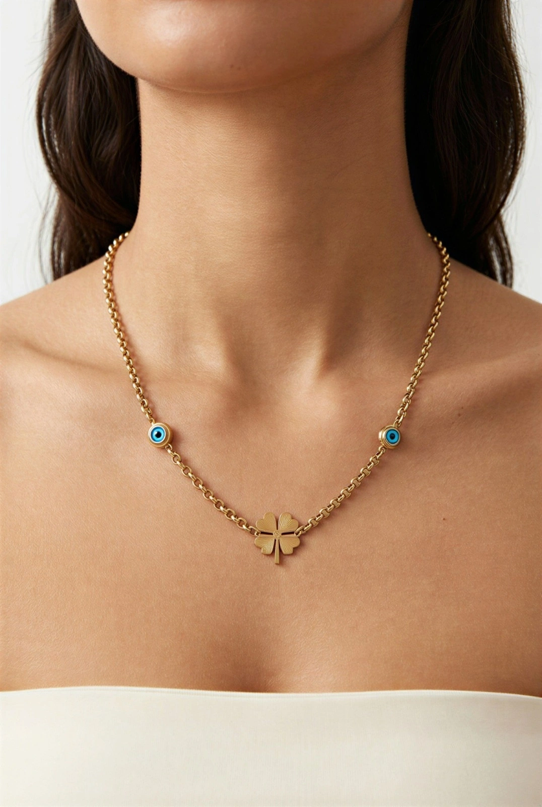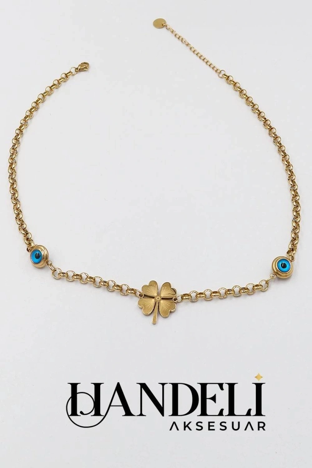 İki Göz Yonca Model Gold Altın Kaplama Çelik Kolye