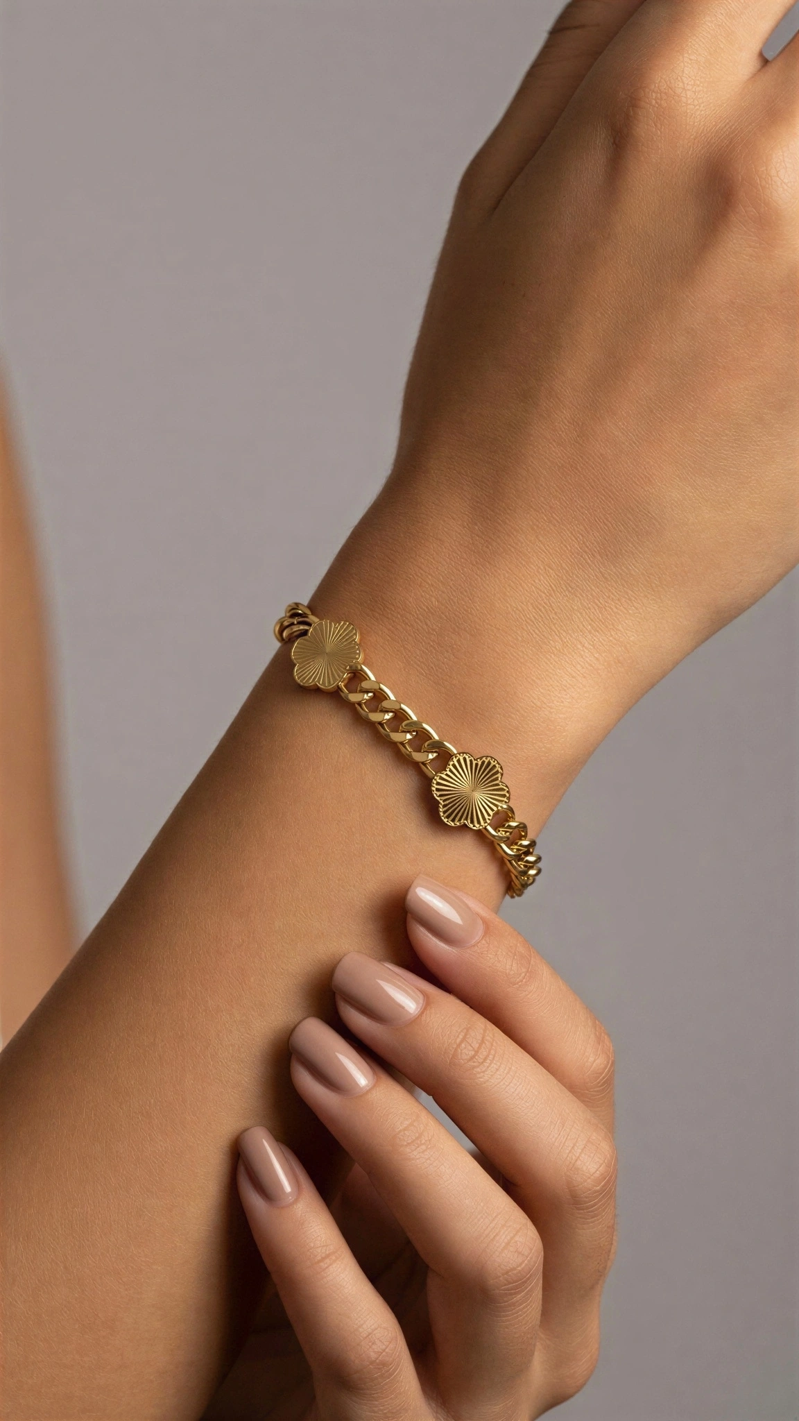Ezik Bağlı Model Yonca Detay Gold Altın Kaplama Çelik Bileklik