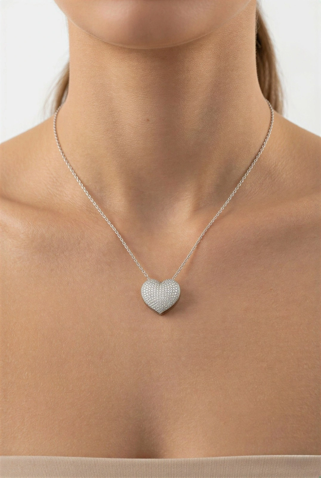 İnce Zincir Büyük Kalp Beyaz Altın Kaplama Çelik Kolye