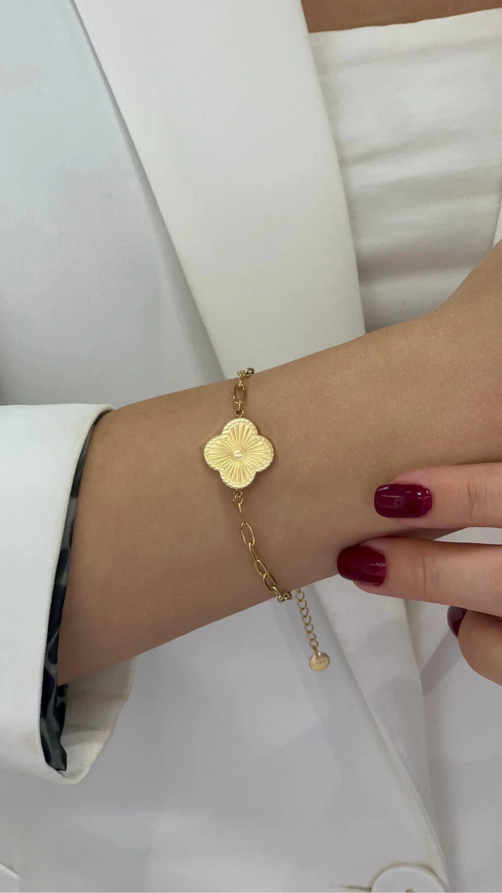 Bu benzersiz bilekliği günlük hayatta, özel günlerde veya sevdiklerinize hediye olarak tercih edebilirsiniz. Stilinizi tamamlamak ve tarzınızı yansıtmak için Yonca Model Gold Altın Kaplama Çelik Bileklik sizinle!