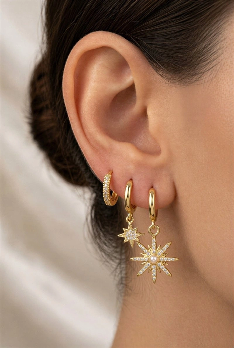 İnci Model Gold Altın Kaplama Üçlü Küpe