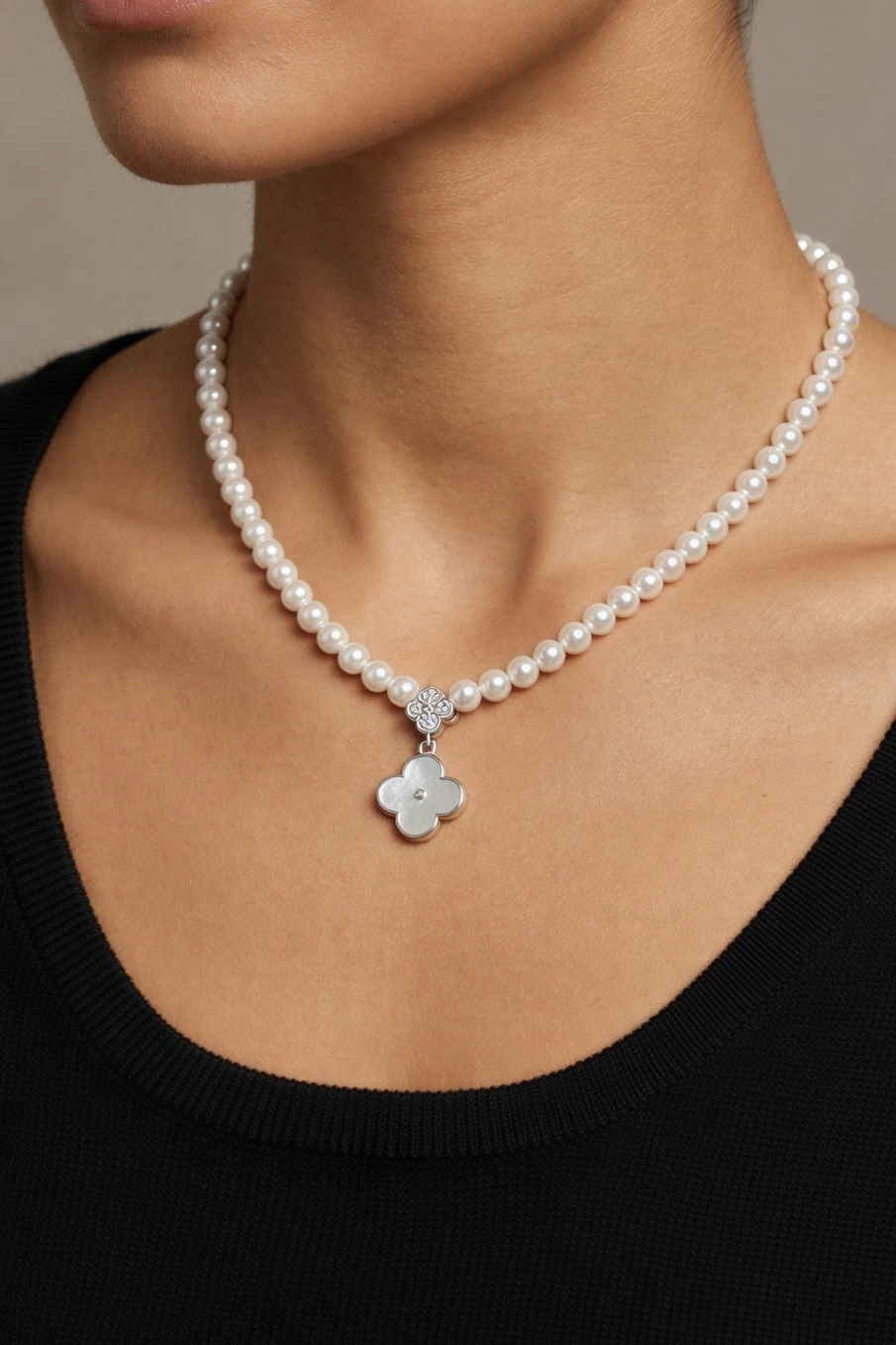 İnci Model Taşlı Sedef Yonca Detay Gold Altın Kaplama Kolye