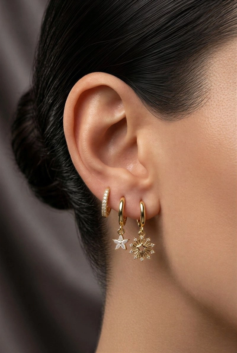 Işık Yıldız Model Gold Altın Kaplama Üçlü Küpe