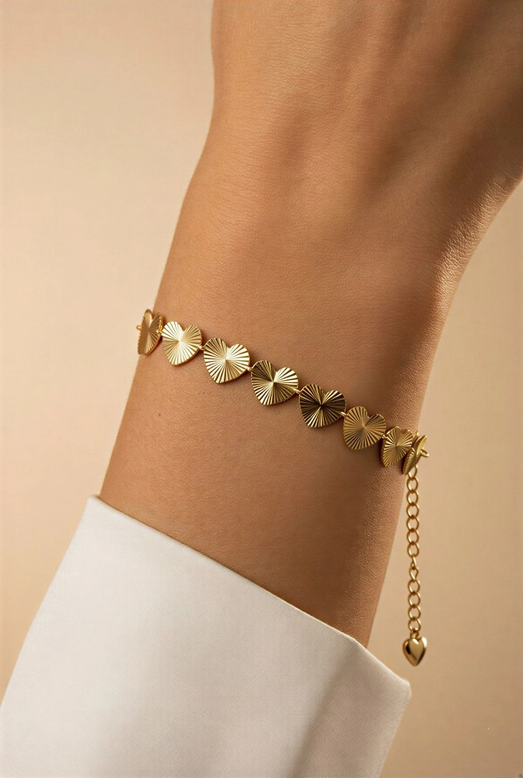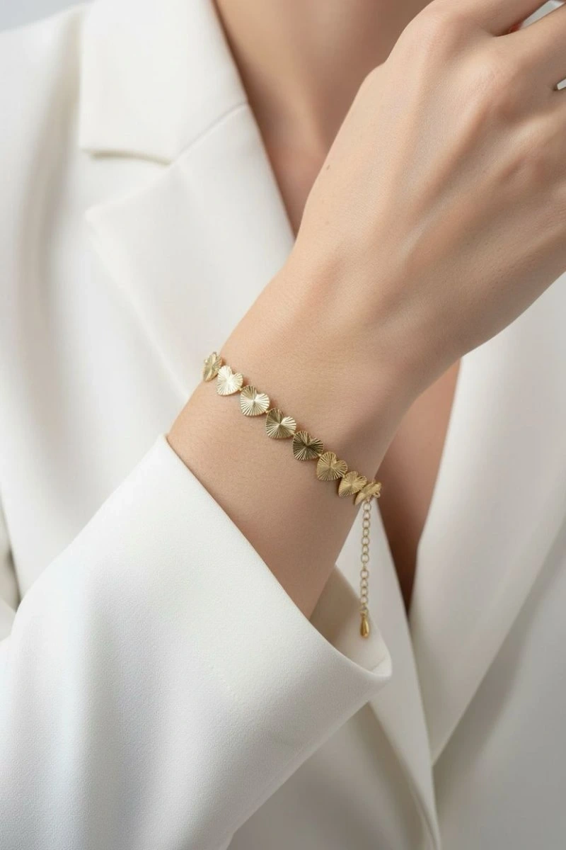 Işıltı Model Sıralı Kalp Detay Gold Altın Kaplama Bileklik