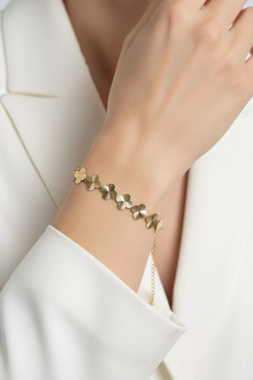 Işıltı Model Sıralı Yonca Detay Gold Altın Kaplama Bileklik