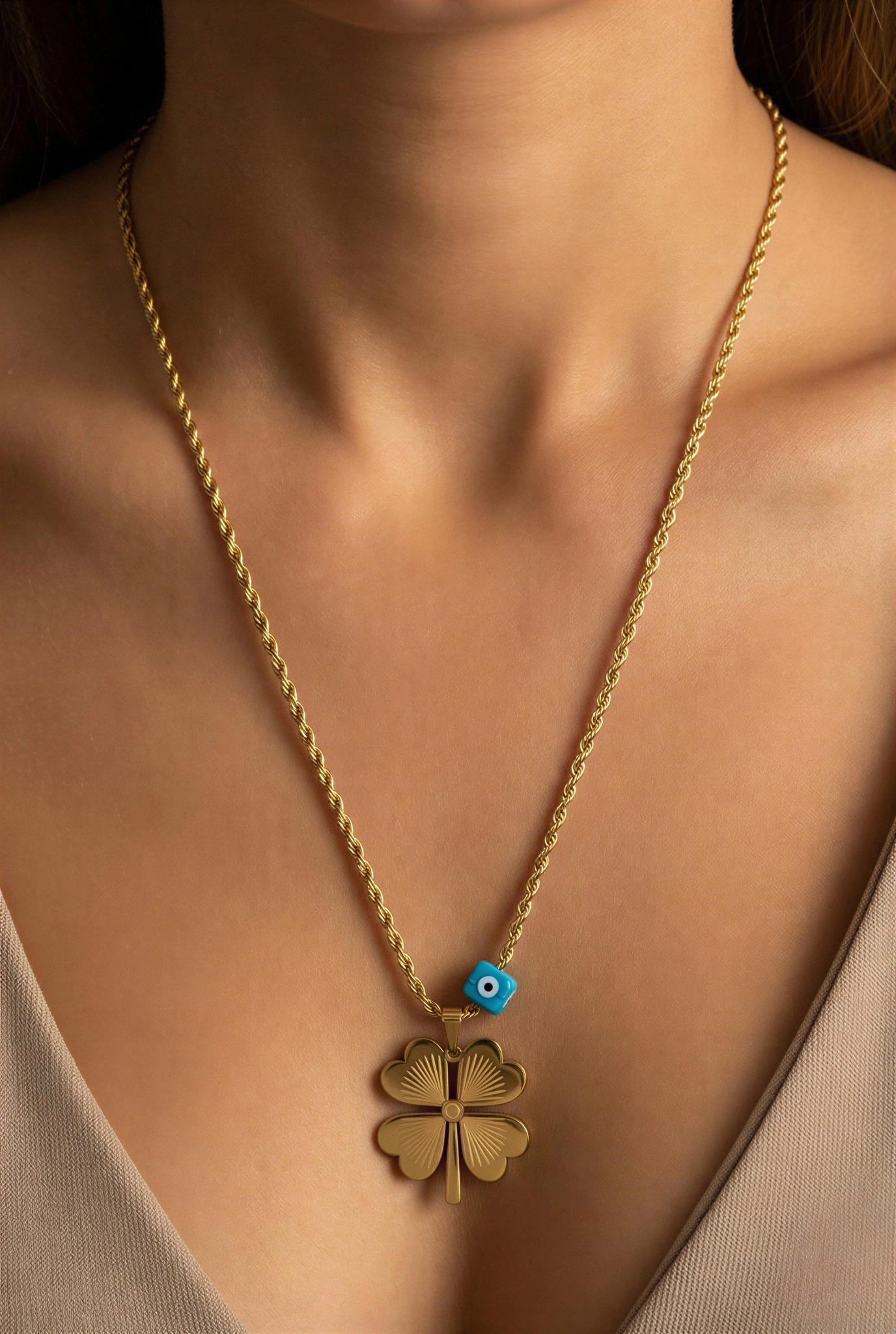 - İSİMLİ - Uzun Zincir Cam Boncuklu Orta Yonca Detay Gold Altın Kaplama Kolye