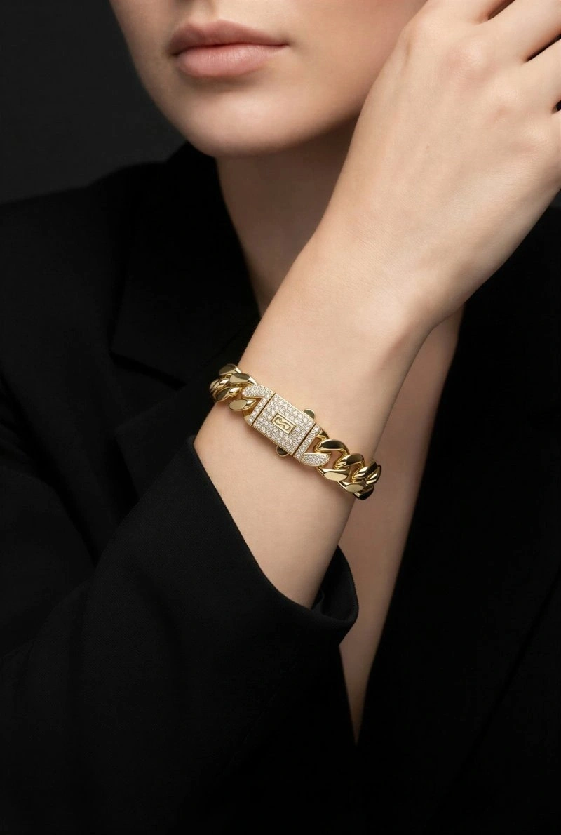 Kalın Ezik Bağlı Model Taş Detay Gold Altın Kaplama Gurmet Bileklik
