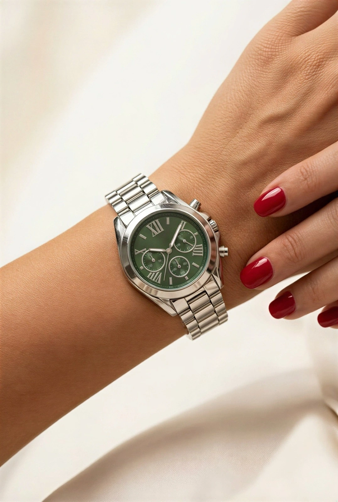 Kapalı Beyaz Kordon Roma Rakam Yeşil Kadran Detay Gold Kadın Kol Saati