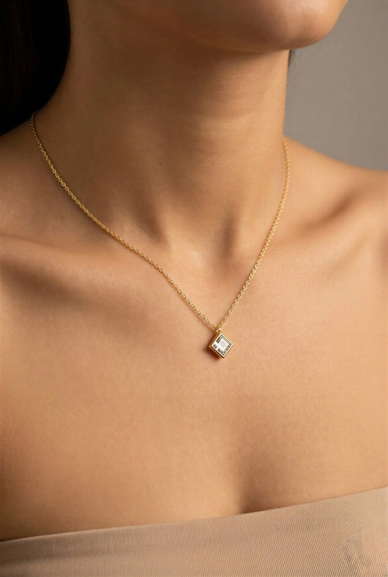 Kare Elmas Model Zarif Gold Altın Kaplama Kolye