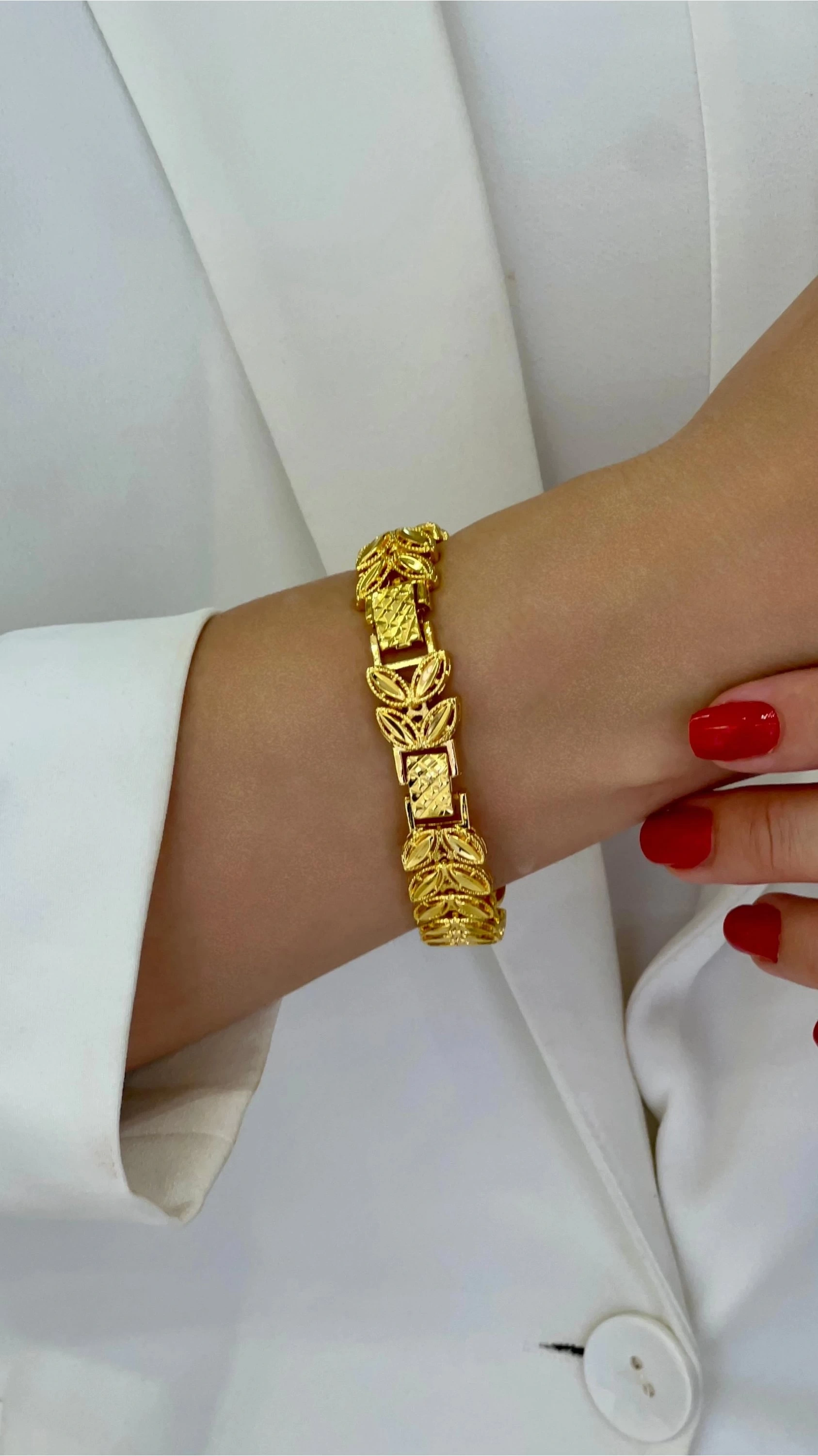 Altın Kaplama Bileklik ile şıklığı ve zarafeti bir arada yaşayın. Kilit Detay Yaprak Model Gold, özel tasarımıyla göz kamaştırıyor.