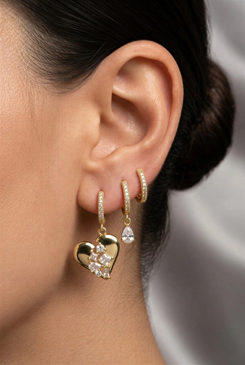 Kırık Kalp Model Gold Altın Kaplama Üçlü Küpe