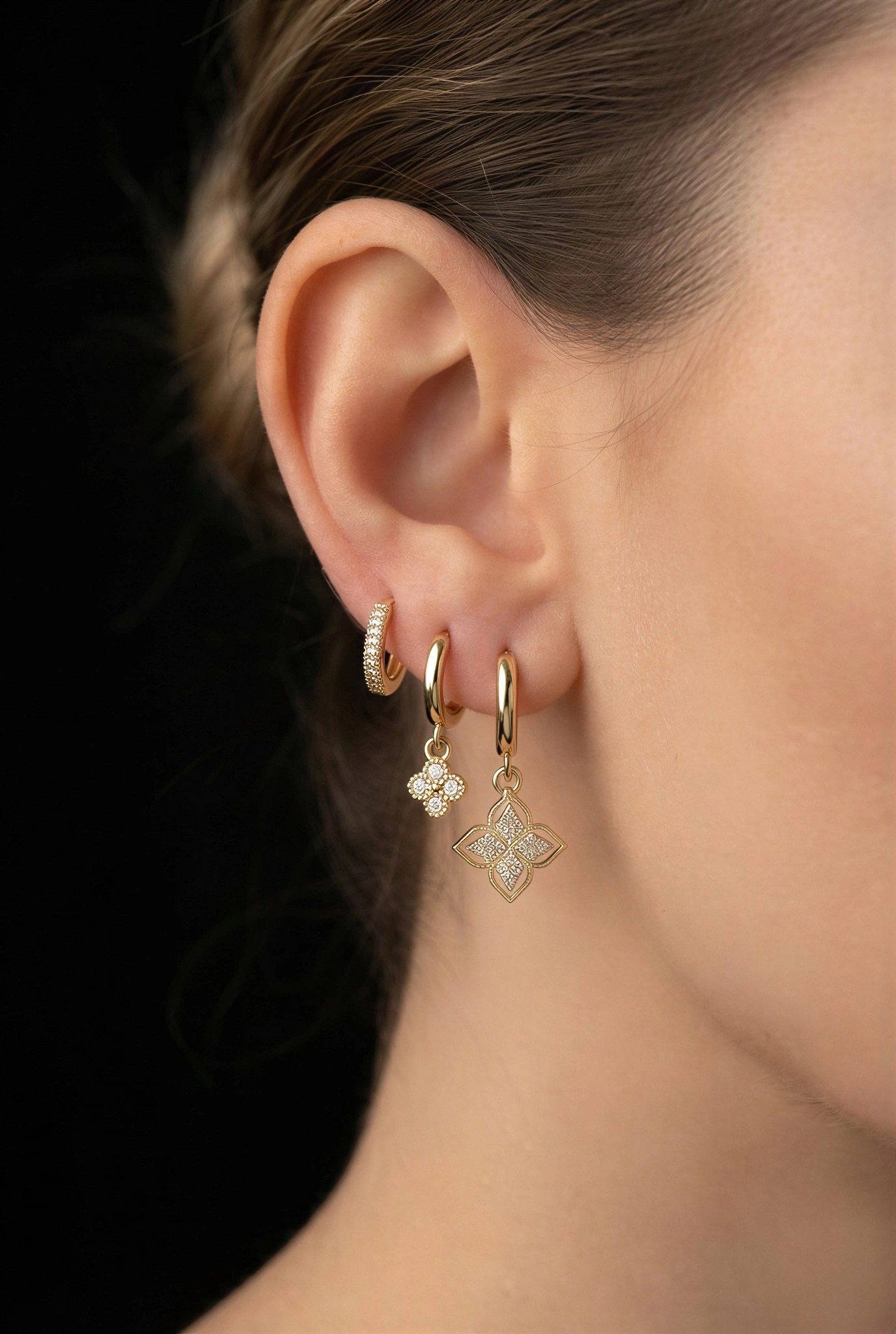 Çiftli Yonca Model Gold Altın Kaplama Üçlü Küpe