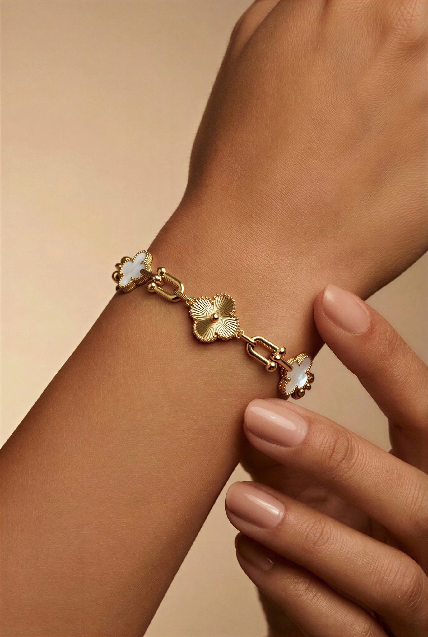 Nal Zincir Beyaz Yonca Model Gold Altın Kaplama Bileklik