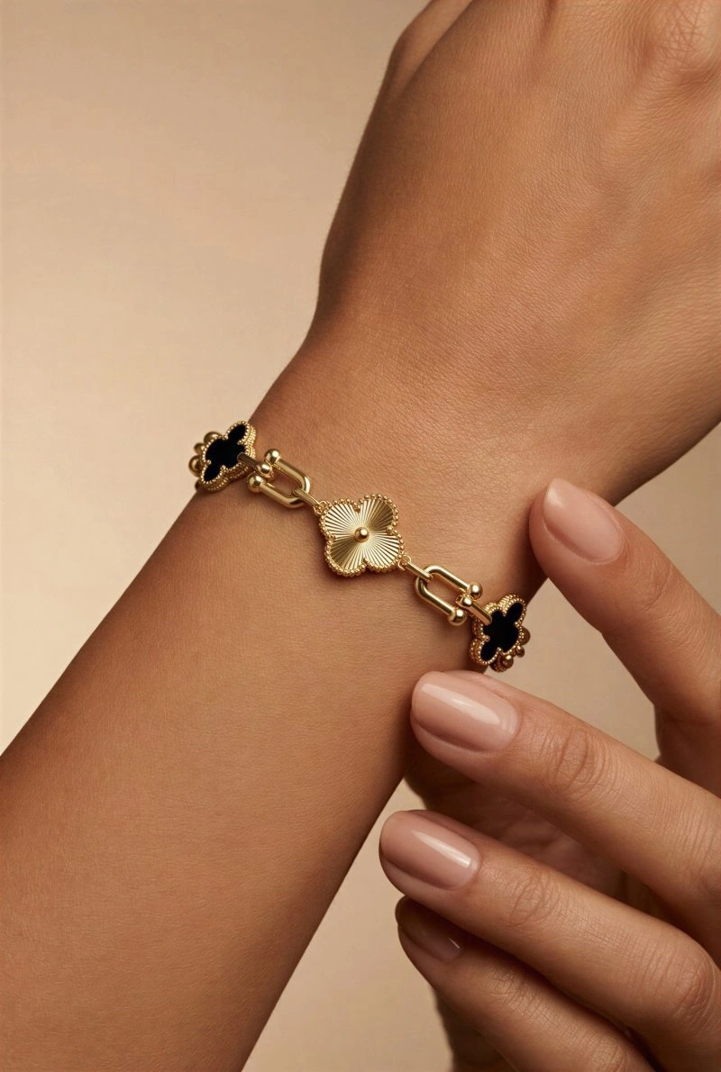 Nal Zincir Siyah Yonca Model Gold Altın Kaplama Bileklik