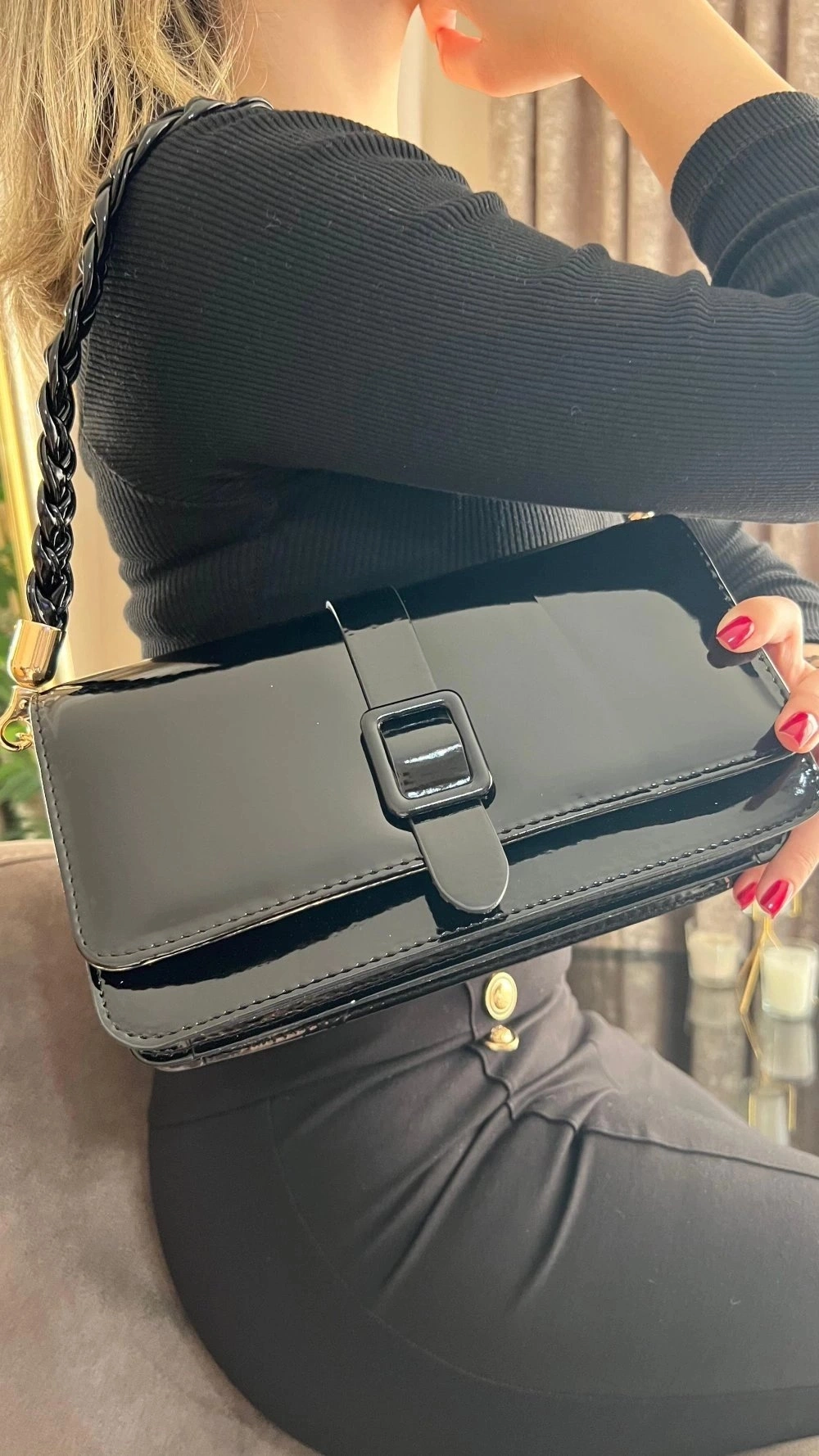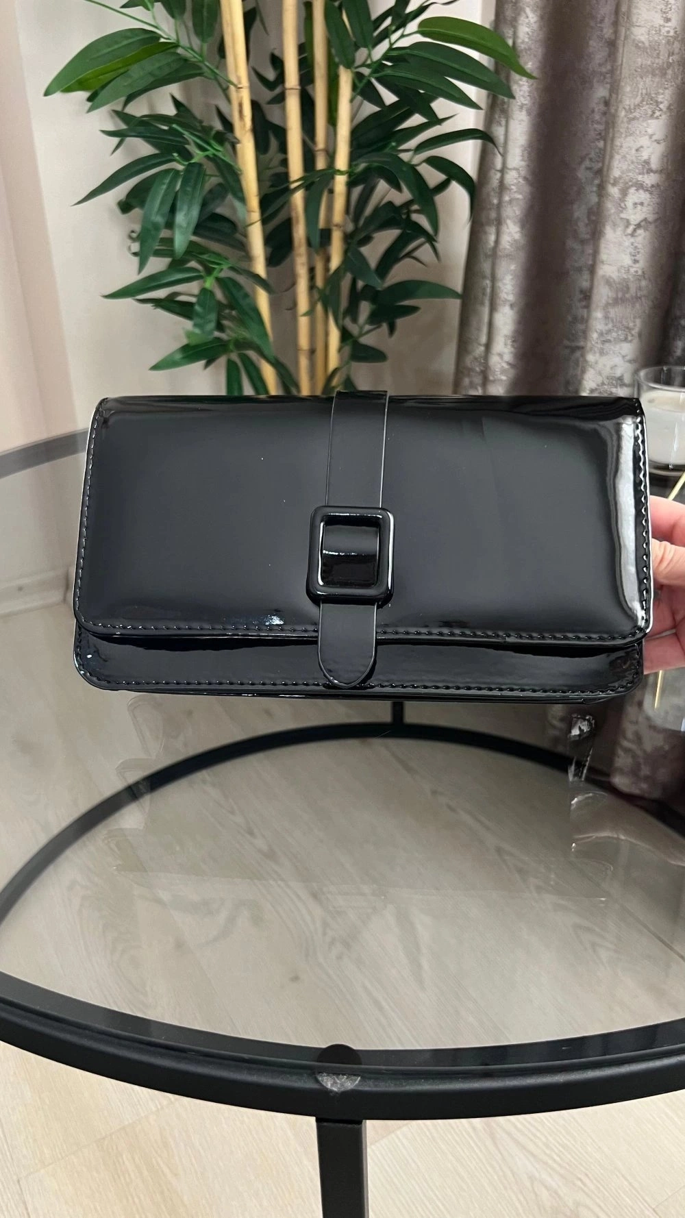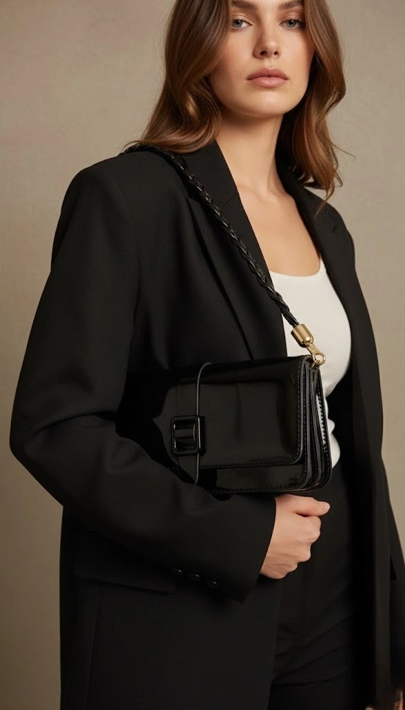 Paris Model Parlak Siyah Deri Kol Çantası